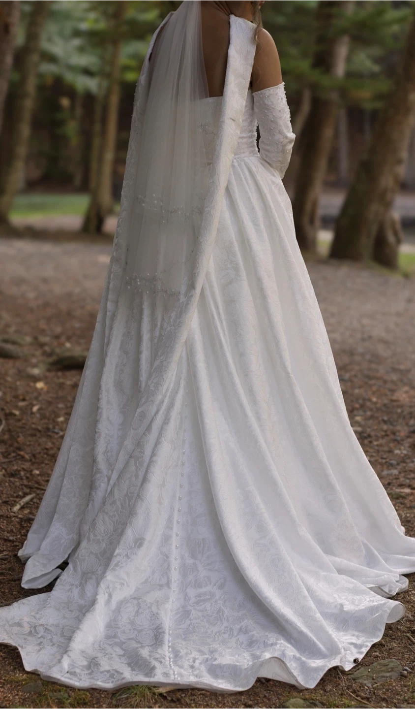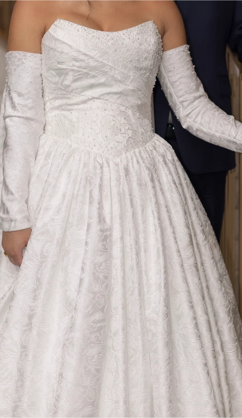 Beautiful white wedding dress with intricate floral jacquard pattern. It features a strapless bodice with detachable long sleeves and a matching scarf. Train for a dramatic finish!