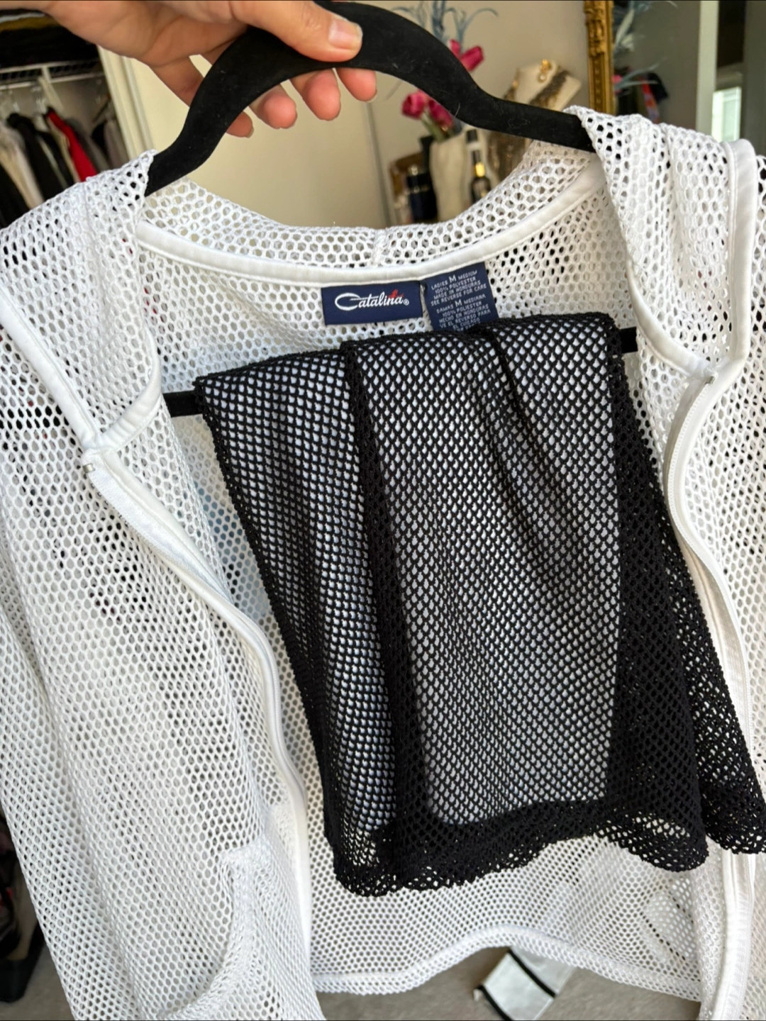 Black and white striped skirt, and a white mesh zip-up jacket. The set could be a fantastic addition to your wardrobe.