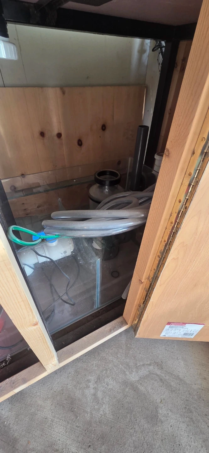 This is a large glass aquarium set up on a wooden cabinet. It includes a fluorescent light fixture. A few plumbing components are visible inside the tank and in the cabinet.
