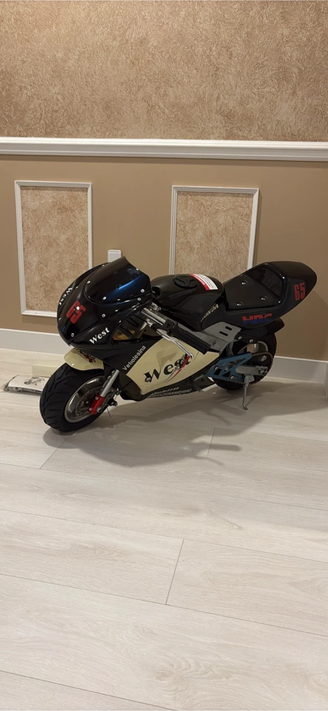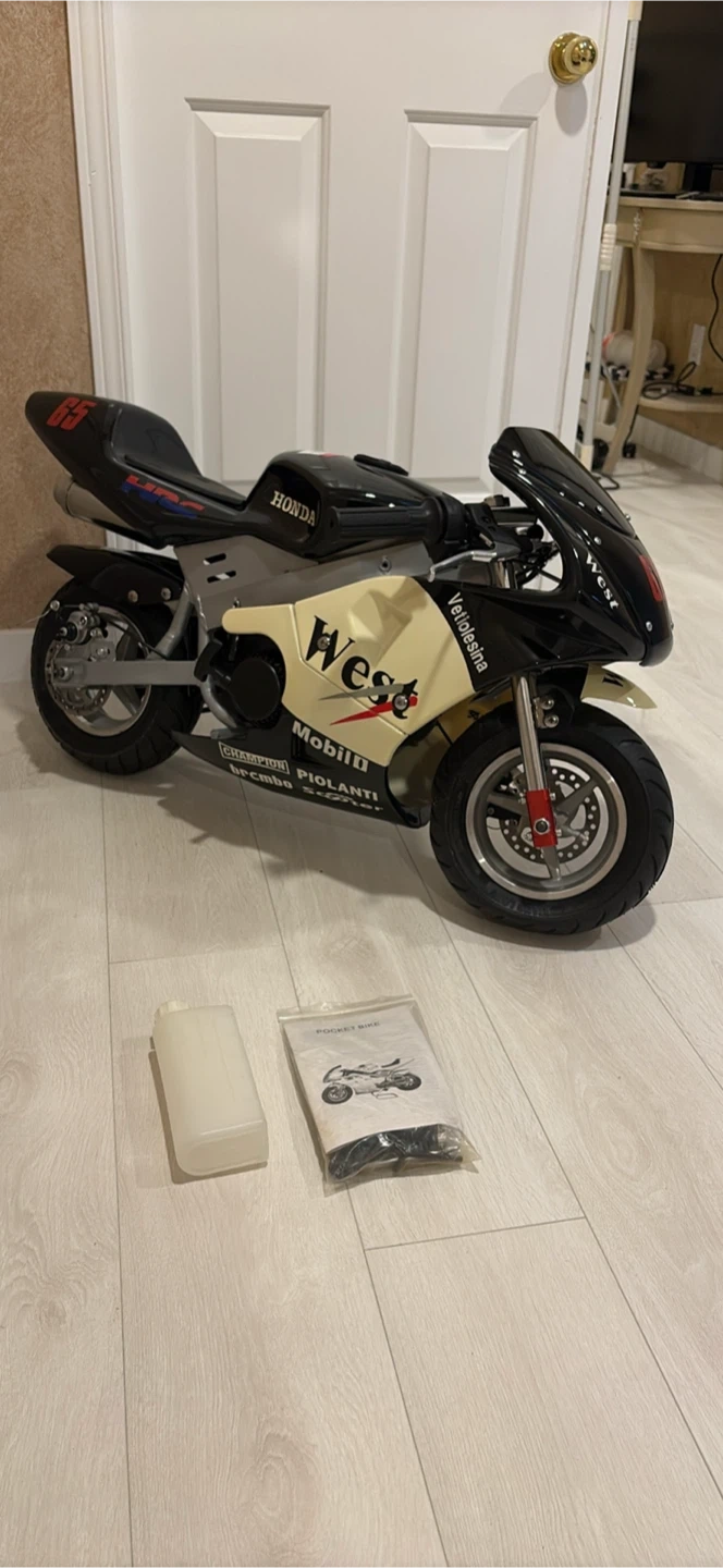 A fun pocket bike with a Honda-inspired design. It includes a fuel bottle and a manual and tools. Engine never ran or touched a road. Best as a display item. If you want to it to run it will need a new gas tank and front tire. Open to trades as well