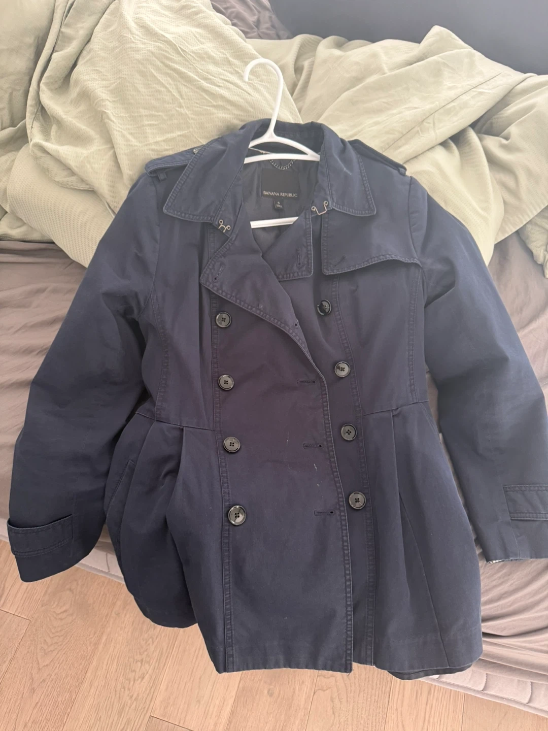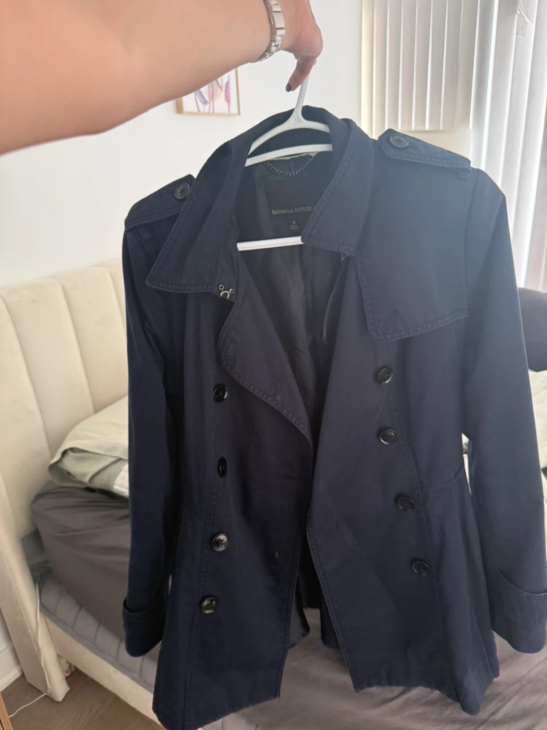 Banana Republic trench coat in navy blue. It's a double-breasted style with a belt. Size is 6.