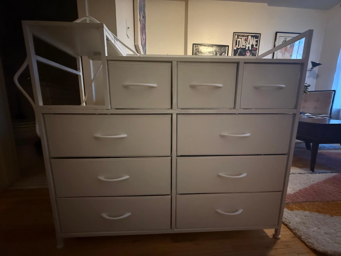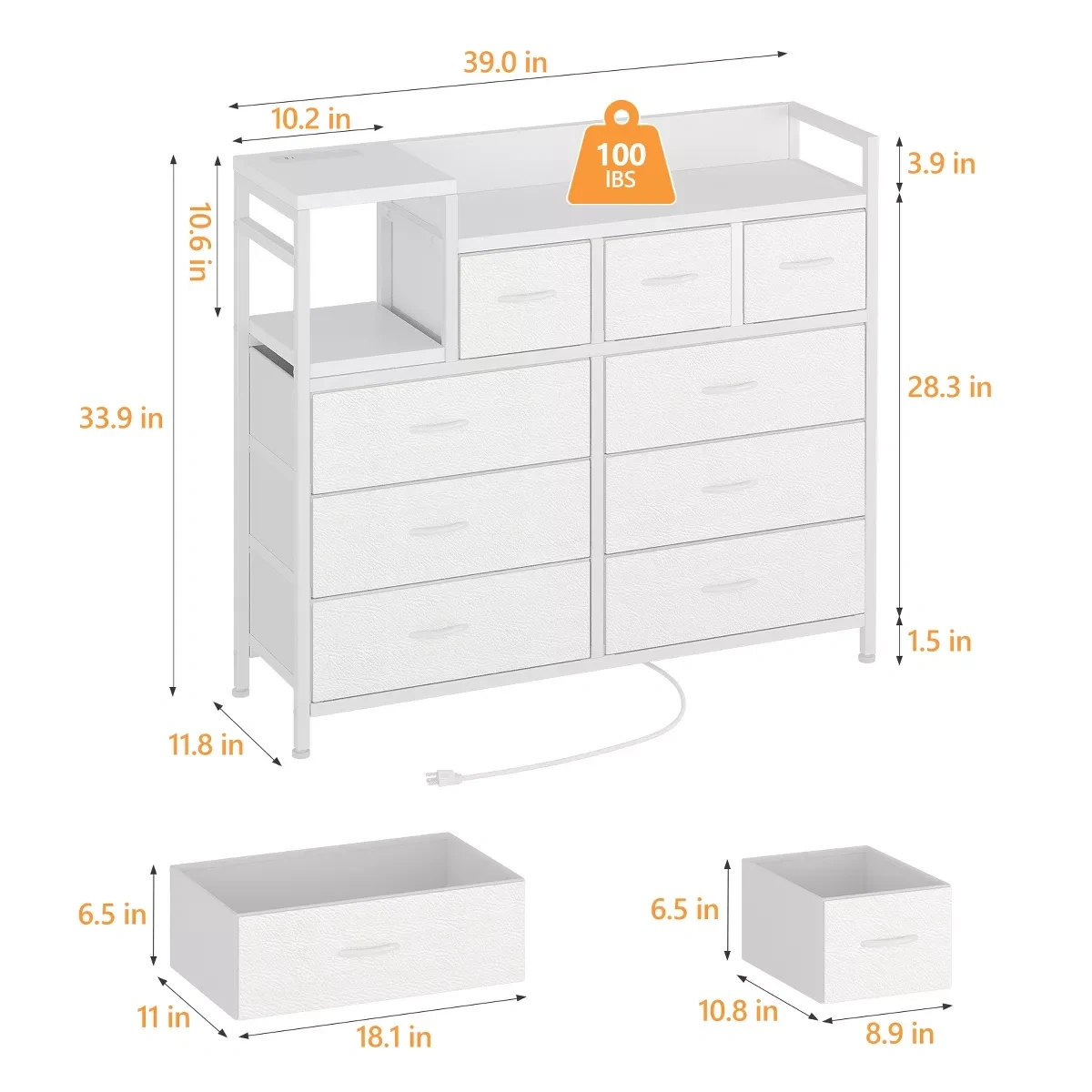 This white dresser has 9 large fabric drawers for sorting and storing items. It's 39.0 inches wide and 33.9 inches tall. Includes a built-in power outlet strip on the top shelf for convenient charging!
