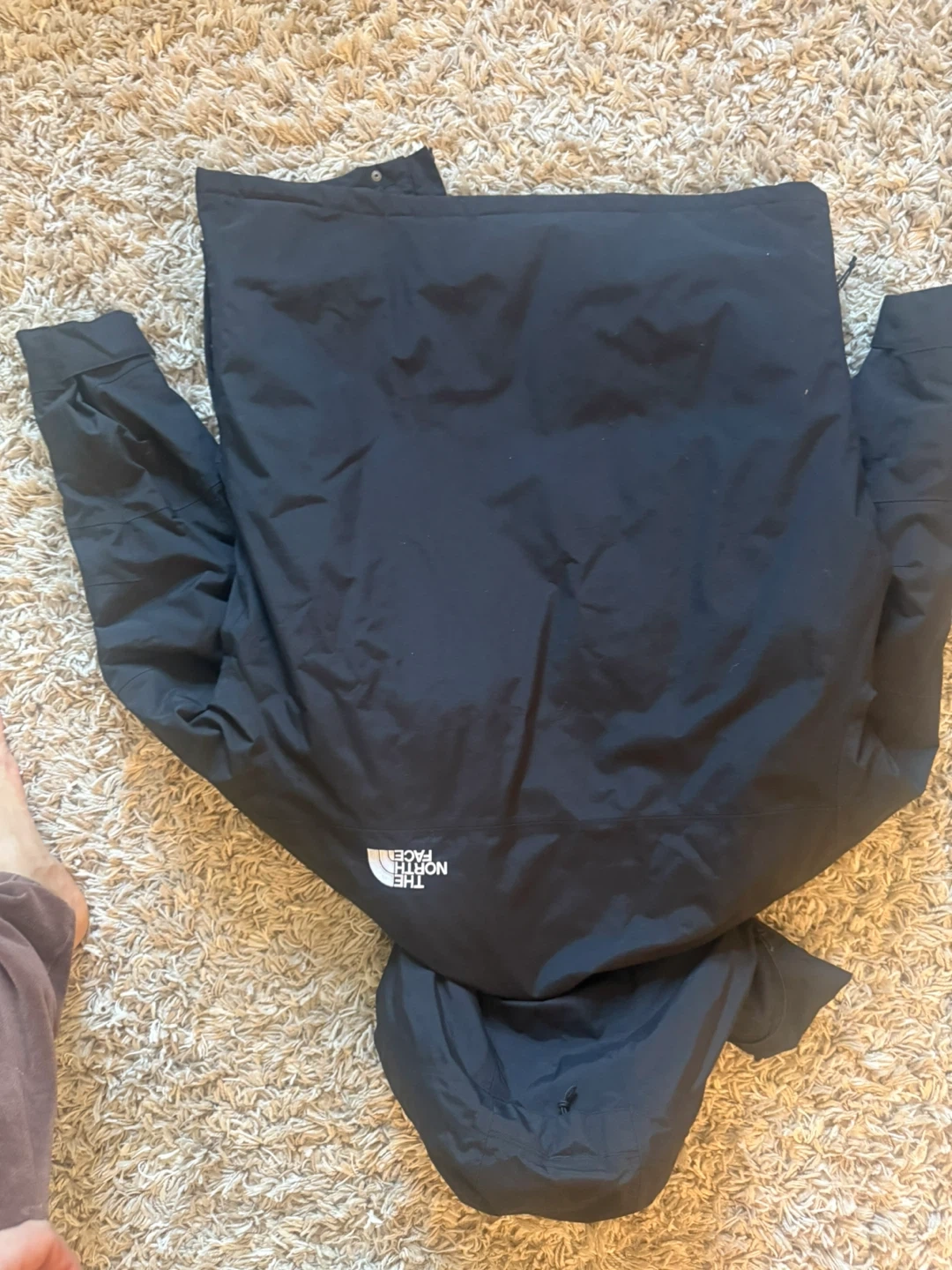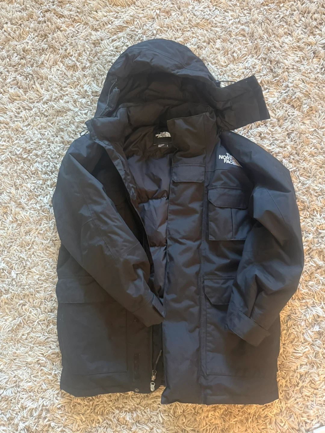 This black puffer parka jacket is from The North Face. It features a hooded design and multiple chest pockets. The jacket is insulated for warmth. size M.