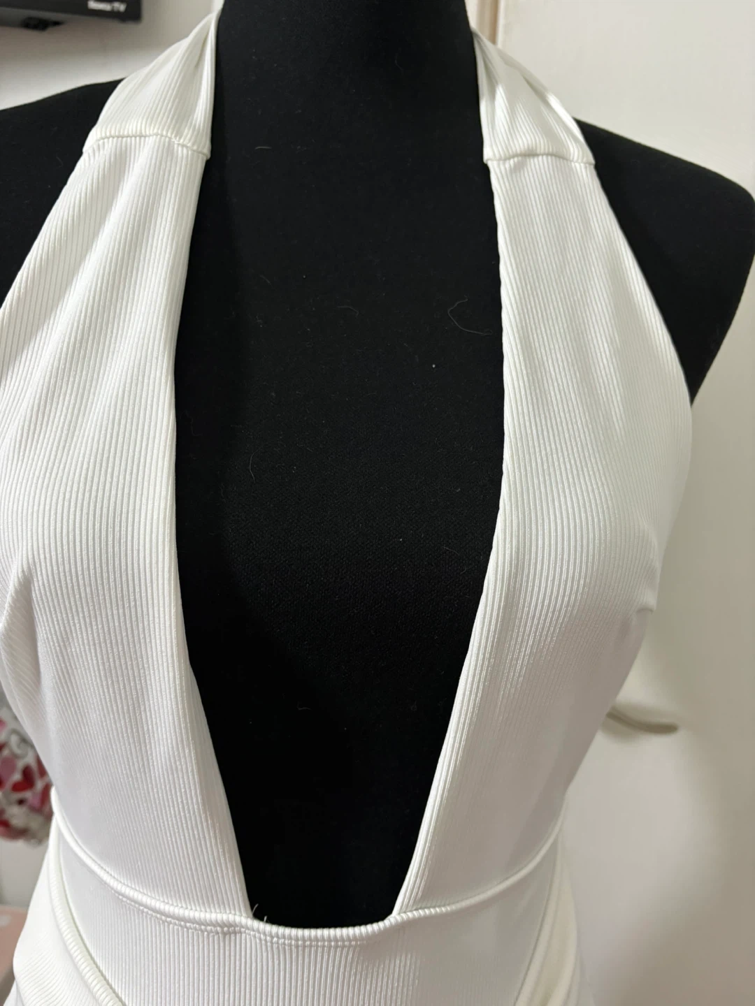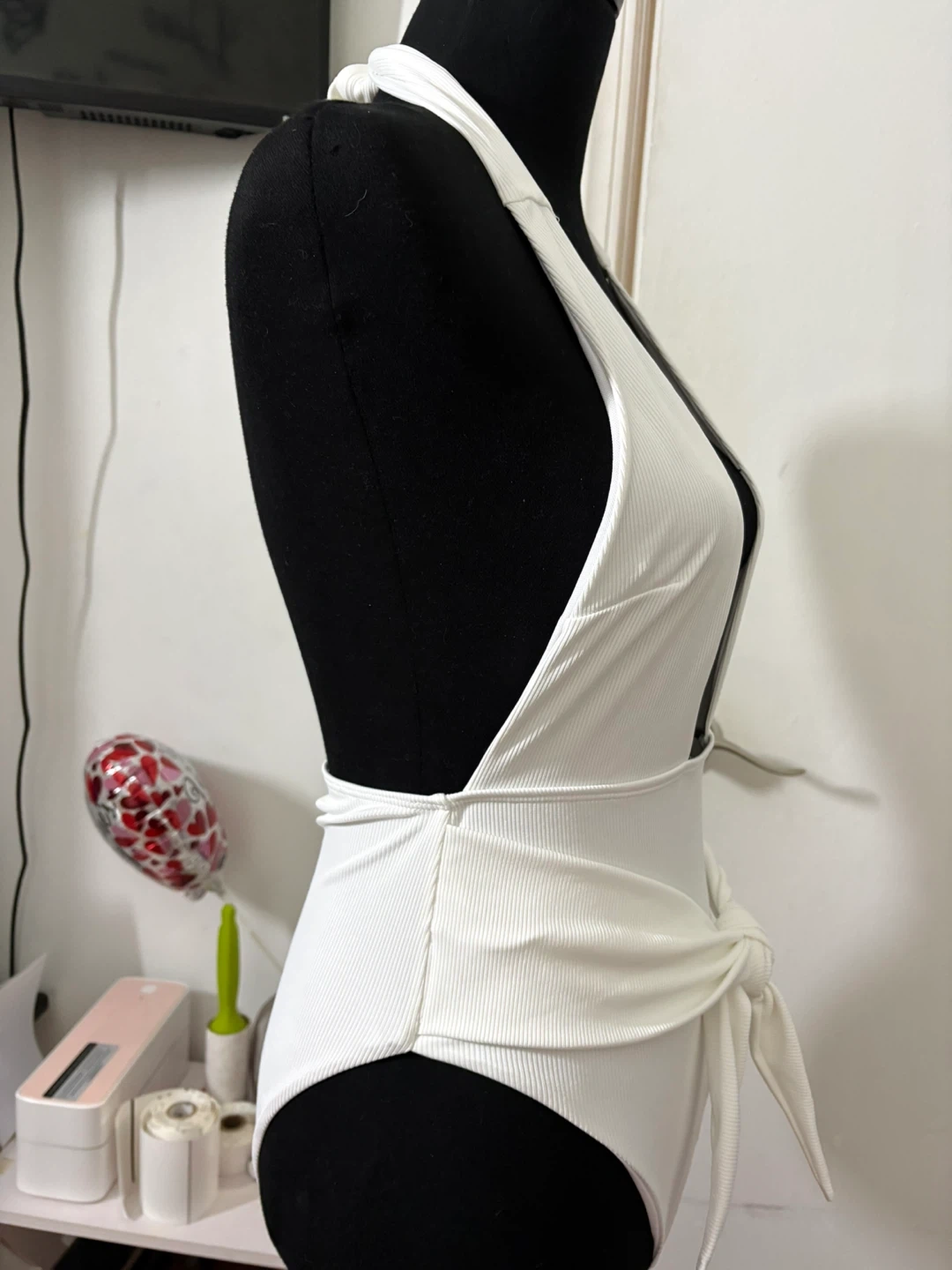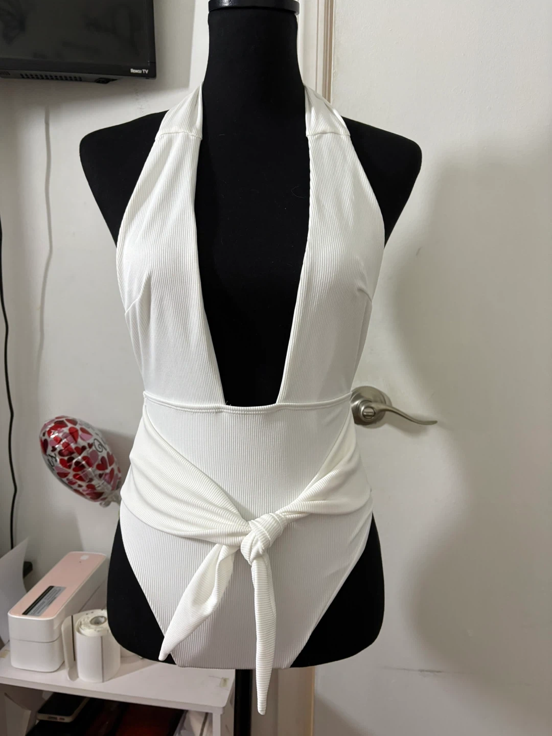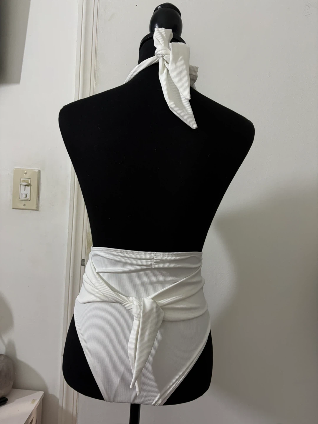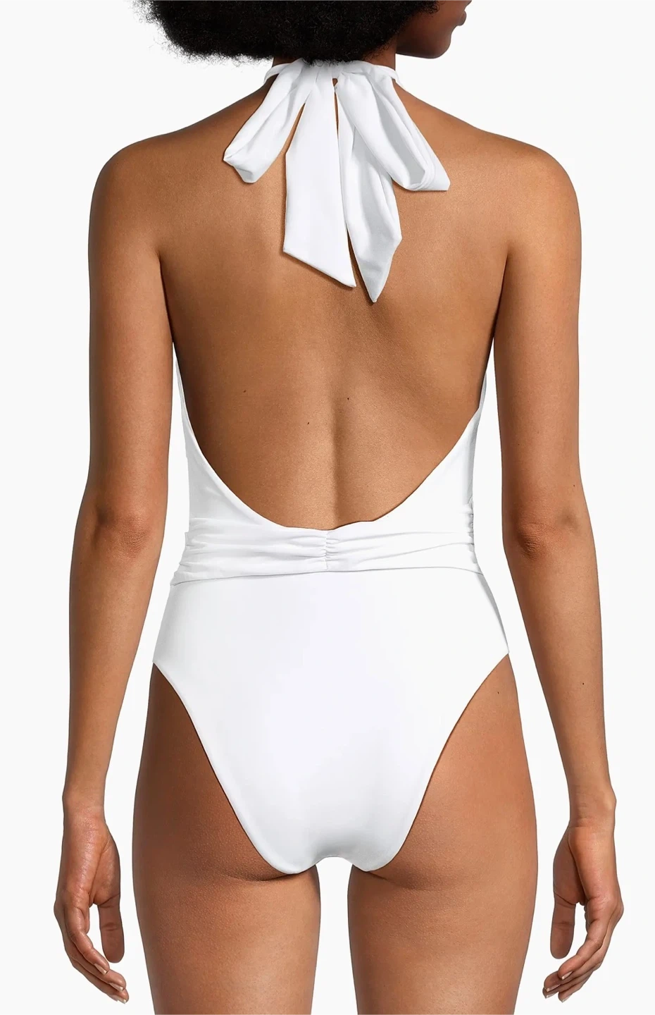 White ribbed one-piece swimsuit with a halter neck and a deep V-neckline. It features a flattering high-cut leg and a tie waist. This swimsuit is made of a stretchy, comfortable material.