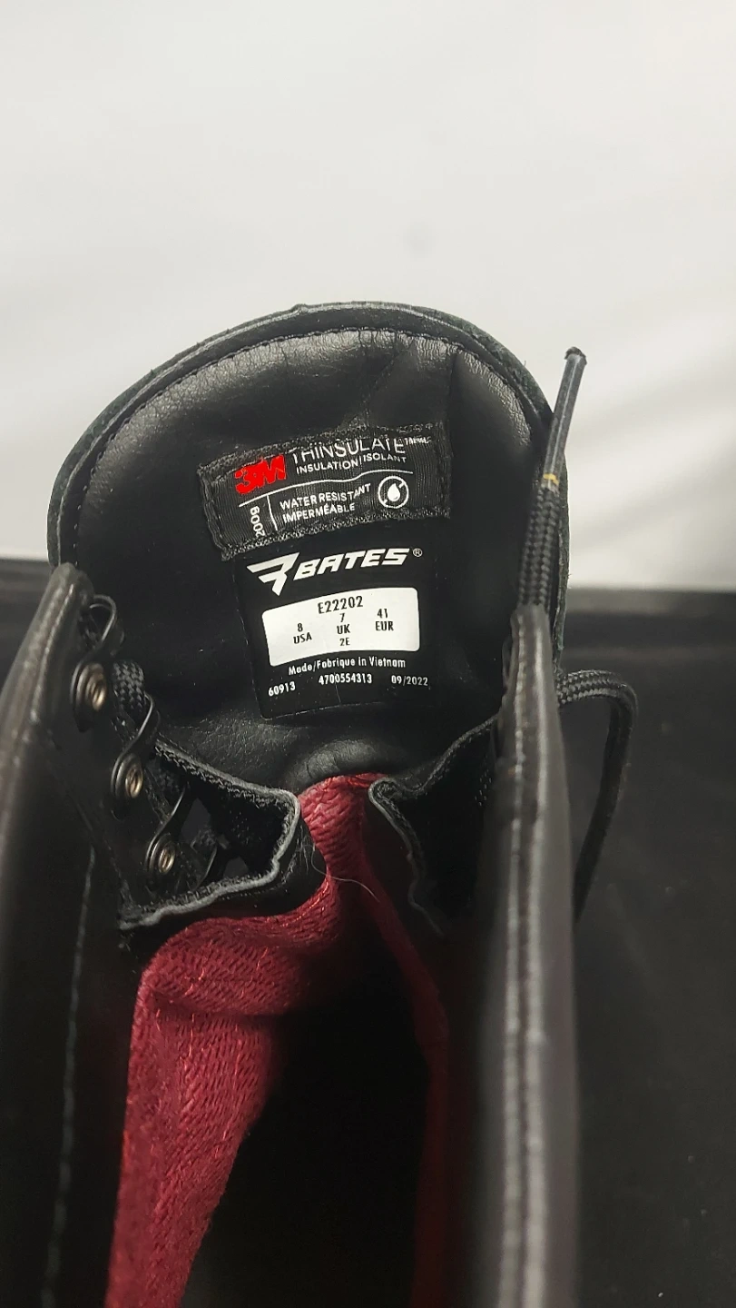 Bates combat boots with Thinsulate insulation and Gore-Tex waterproof lining. Black leather construction. Made in Vietnam. Size 8 USA.