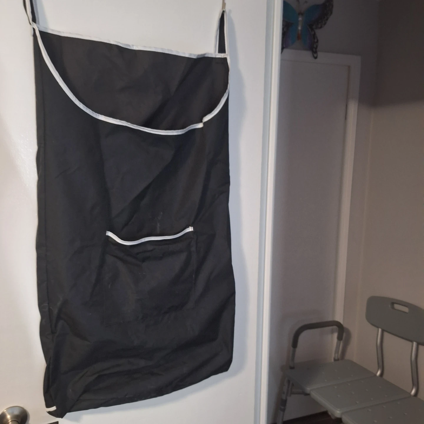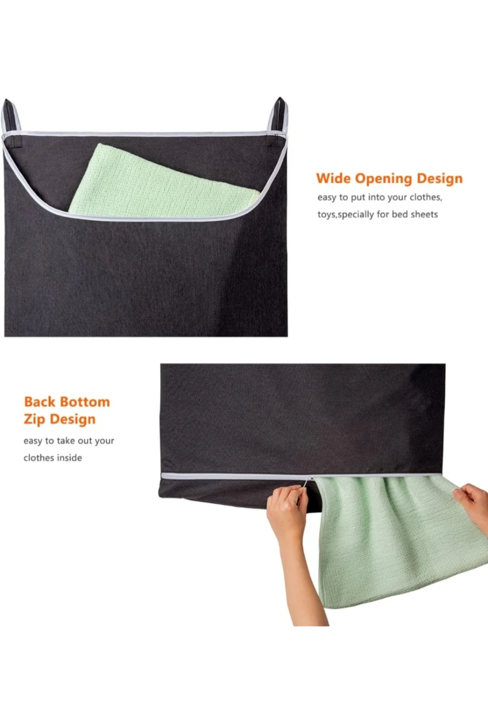 Selling a large capacity hanging laundry hamper in black. It features a wide opening design and a back bottom zip for easy access to your clothes. Perfect for bedrooms or laundry rooms!