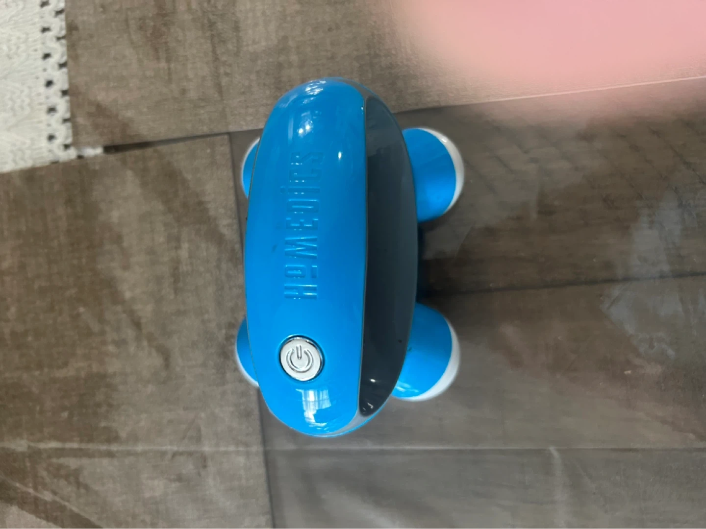 This is a blue and grey HoMedics handheld massager. It has a power button on top and four rolling massage nodes. Perfect for a quick massage on the go!