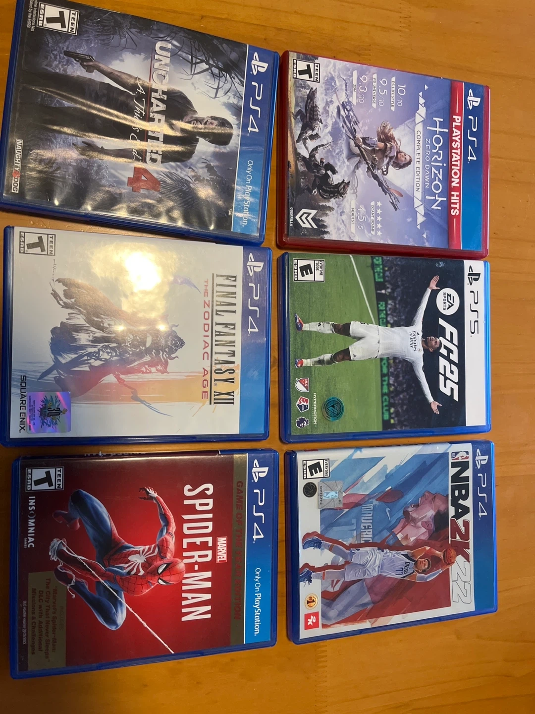 This is a bundle of various PlayStation 4 video games. Games included are Uncharted 4, Horizon Zero Dawn, Final Fantasy XII, FIFA 'XX, Marvel's Spider-Man, NBA 2K22, Madden 'XX, NBA 2K19, NBA 2K17, Madden 'XX, Madden 'XX, Injustice 2, and NBA 2K18. All are for the PS4 and PS5 platform.