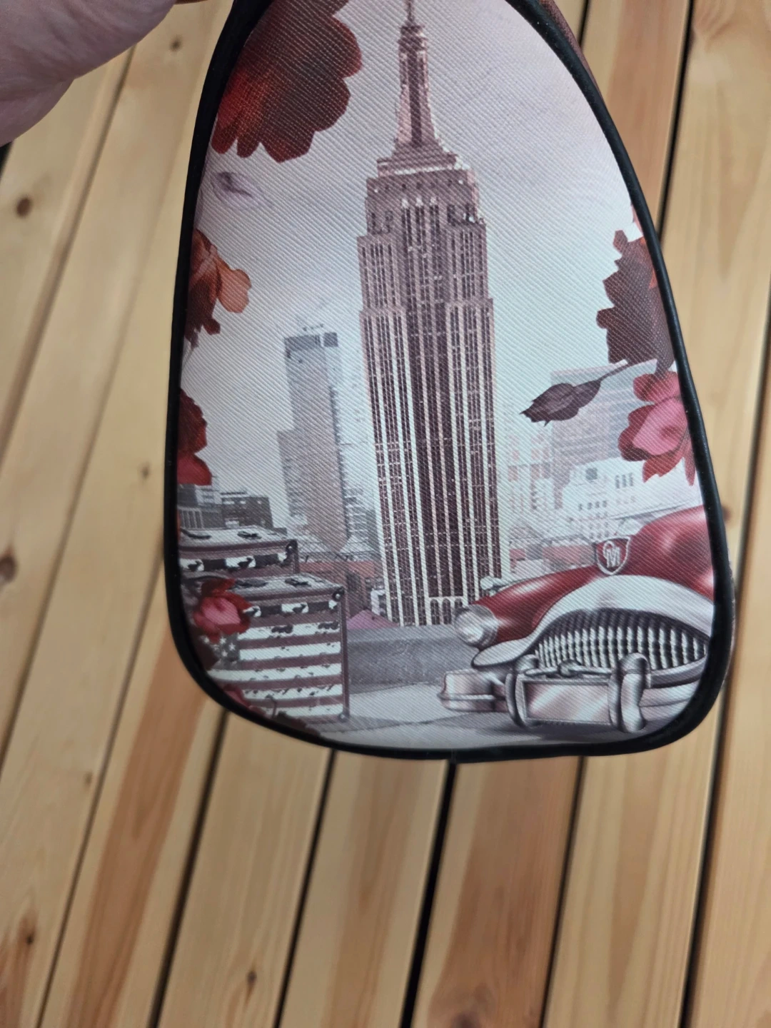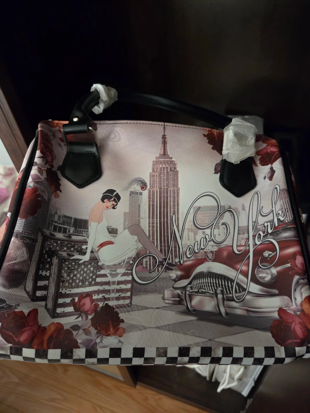 A stylish satchel bag with a New York cityscape and classic car print. It features a checkered bottom and black faux leather handles. This bag is perfect for adding a retro flair to your outfit!