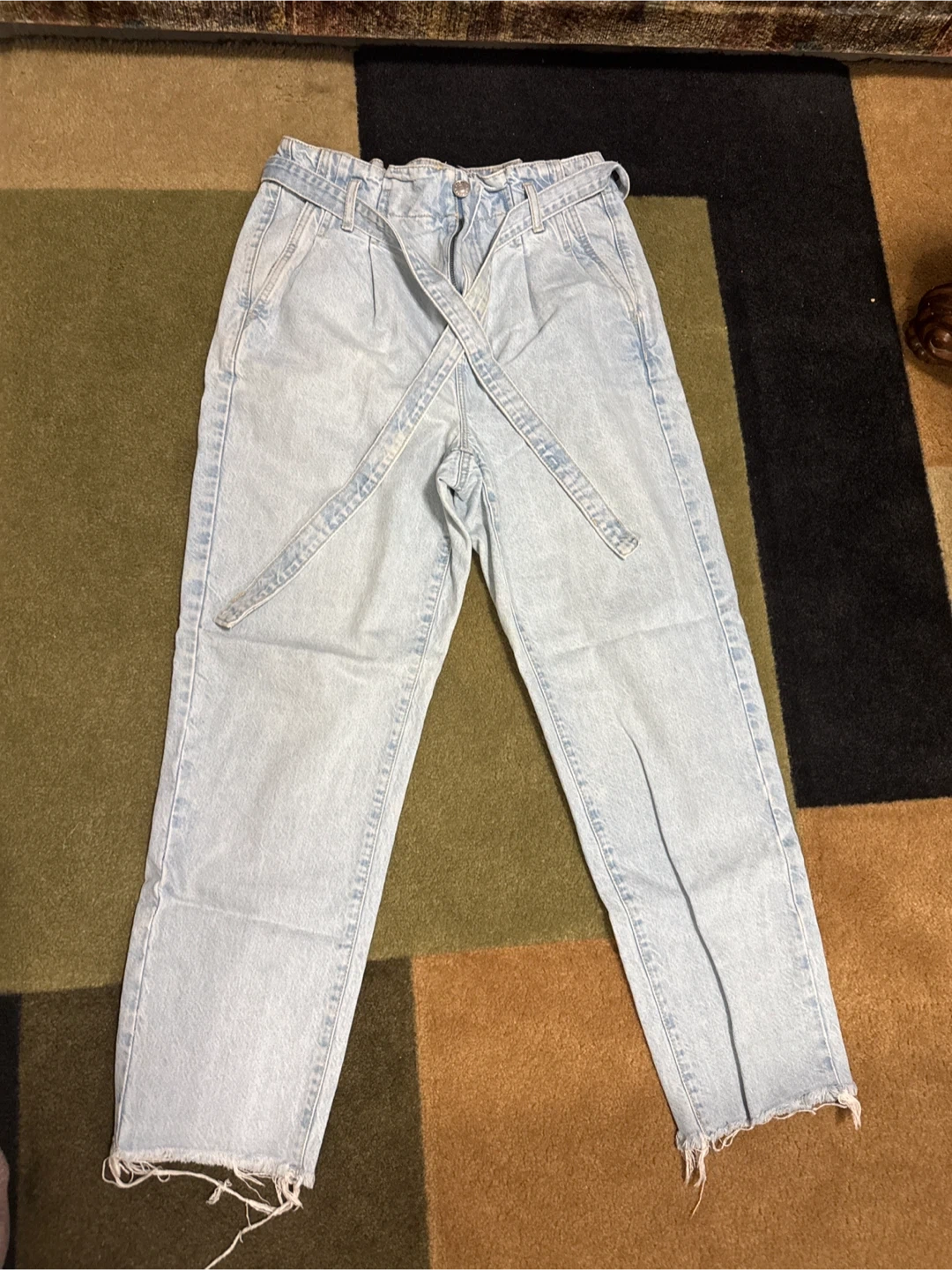 These light wash denim jeans have a high-waisted fit with a tie belt. They feature a paperbag waist and frayed hems. Cotton material.