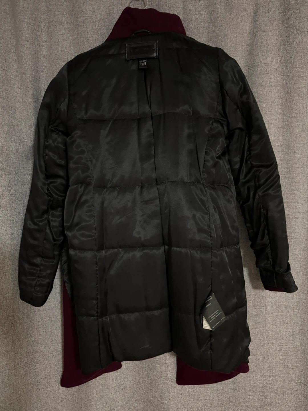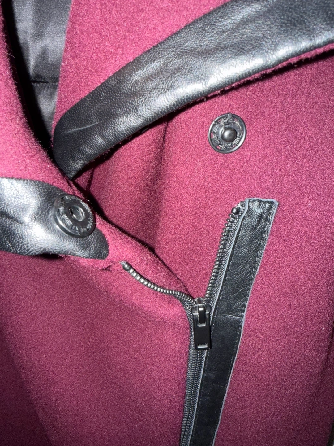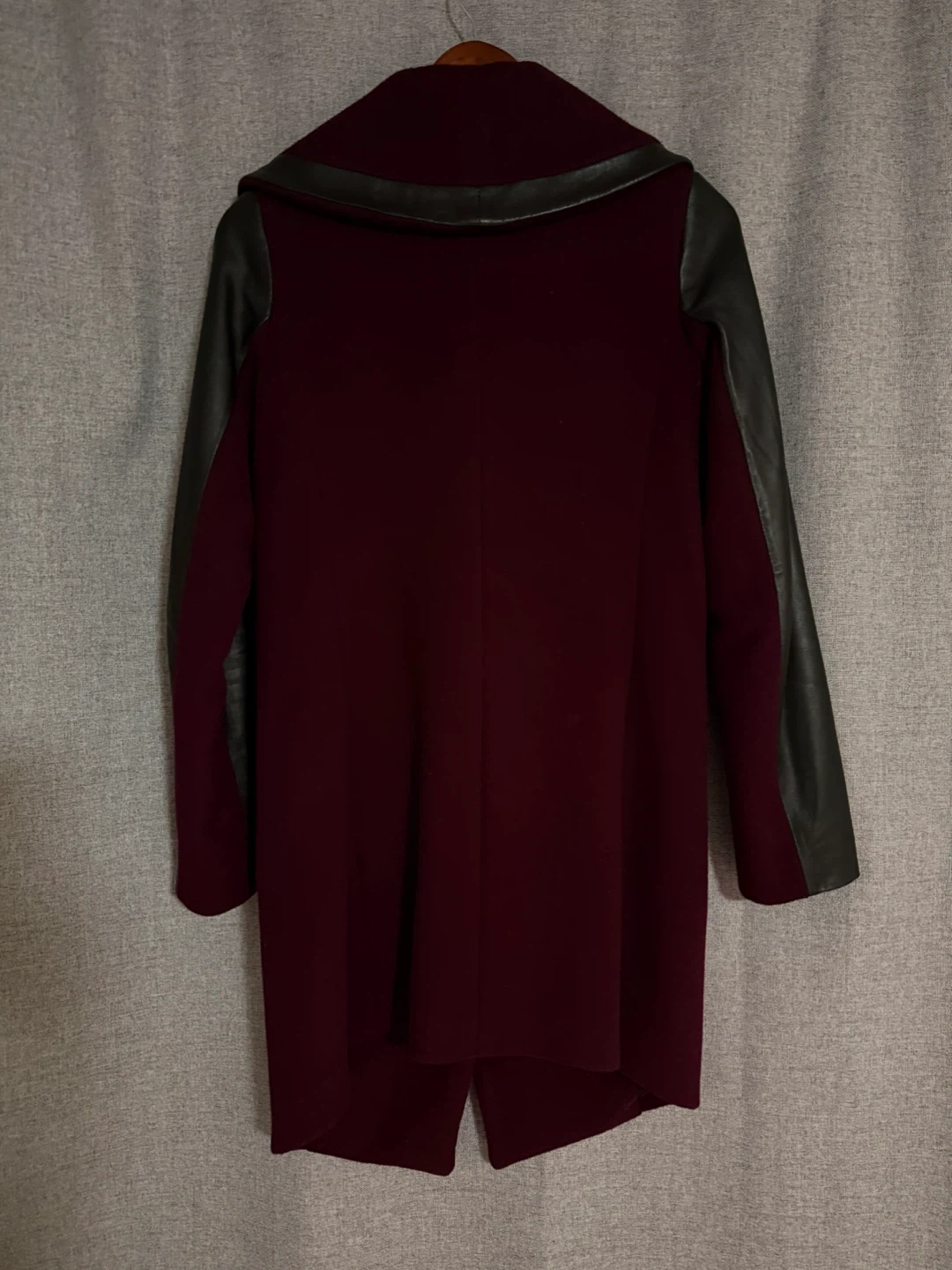This Danier coat features a rich burgundy wool blend with contrasting black leather sleeves. It has an asymmetrical zipper closure and a unique folded collar design. It's a stylish piece perfect for cooler weather.