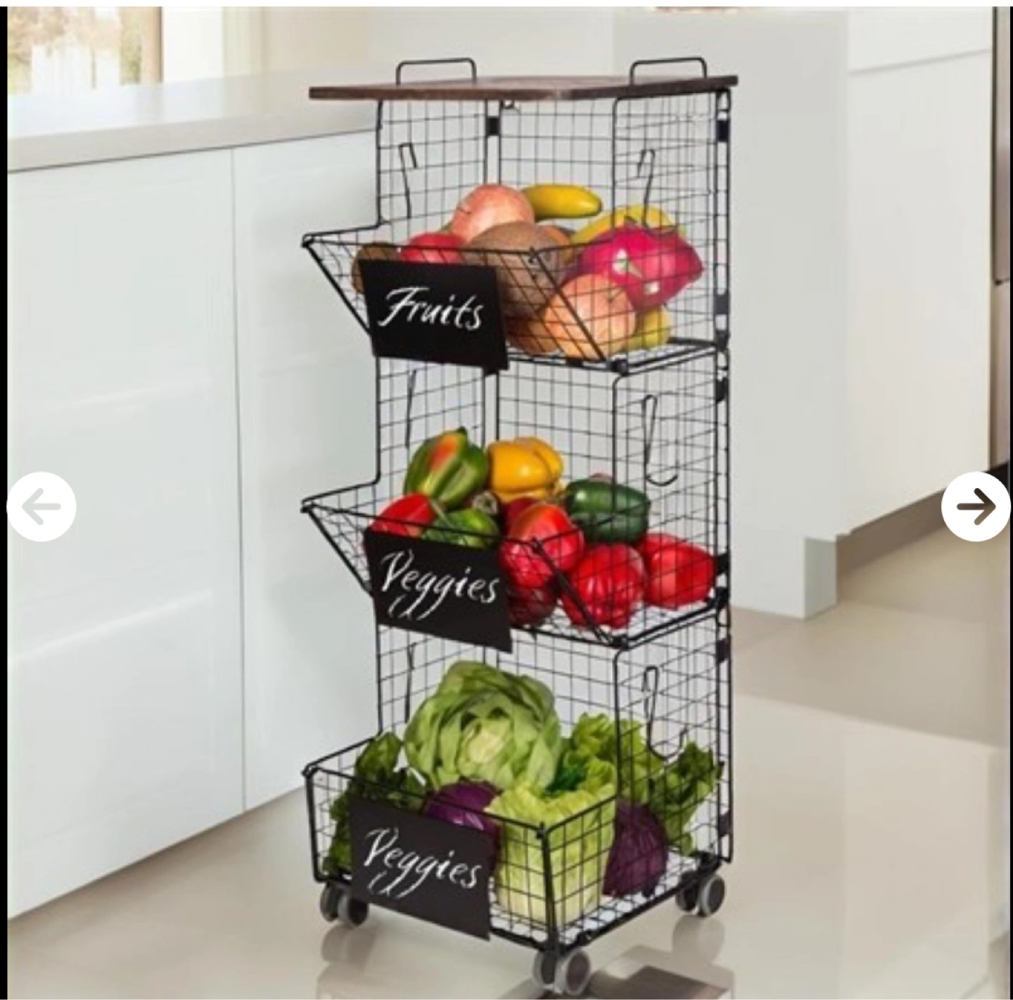 Black wire shelving unit with three baskets. Wooden top. Features small chalkboard signs. Wheels for easy mobility. Perfect for kitchen organization.