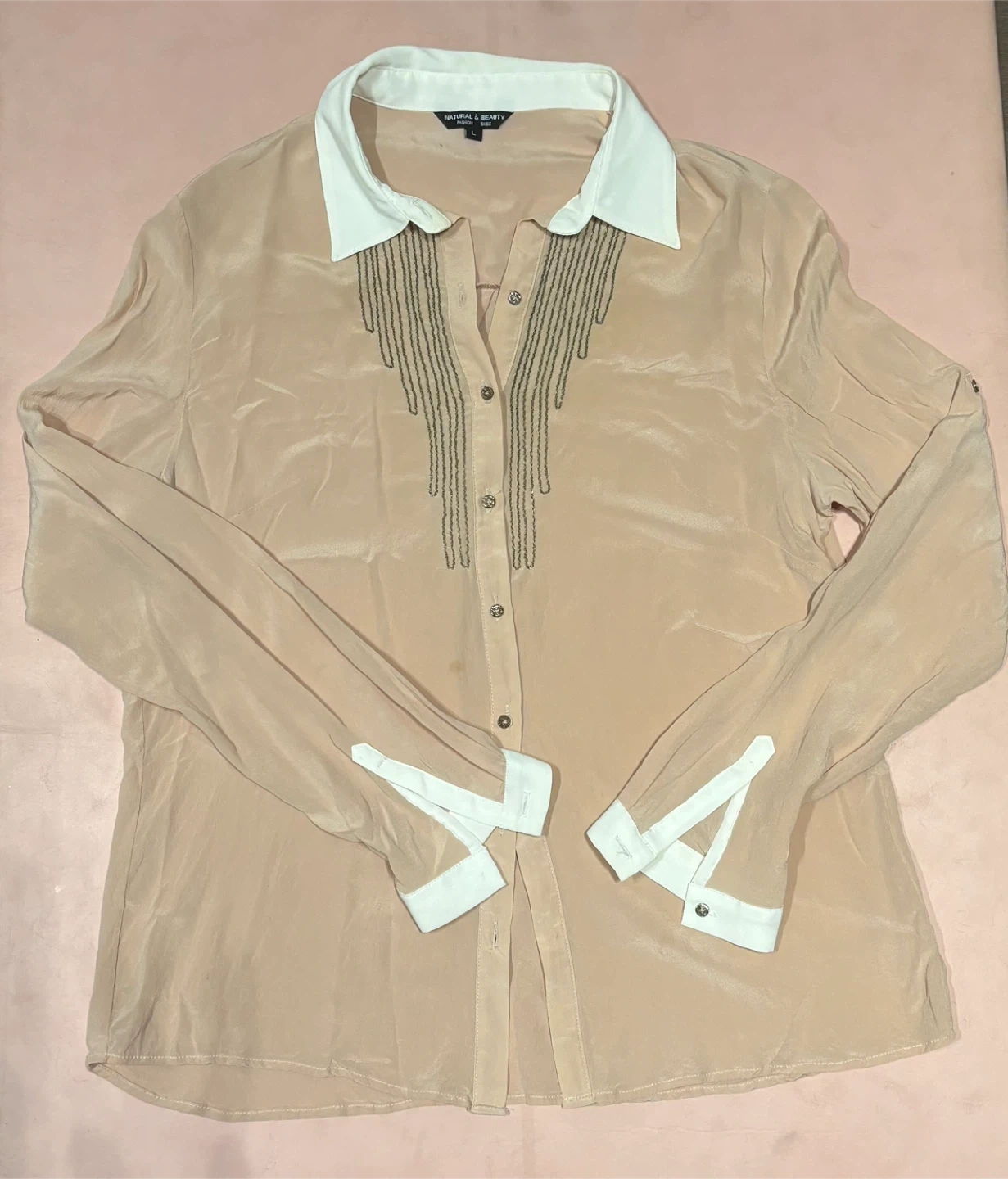 Here's a Natural & Beauty blouse in size L! It’s 100% silk! It features a beige colour with a white collar and cuffs. The blouse also has some nice beaded detailing down the front. It's in great condition and ready for a new home!
