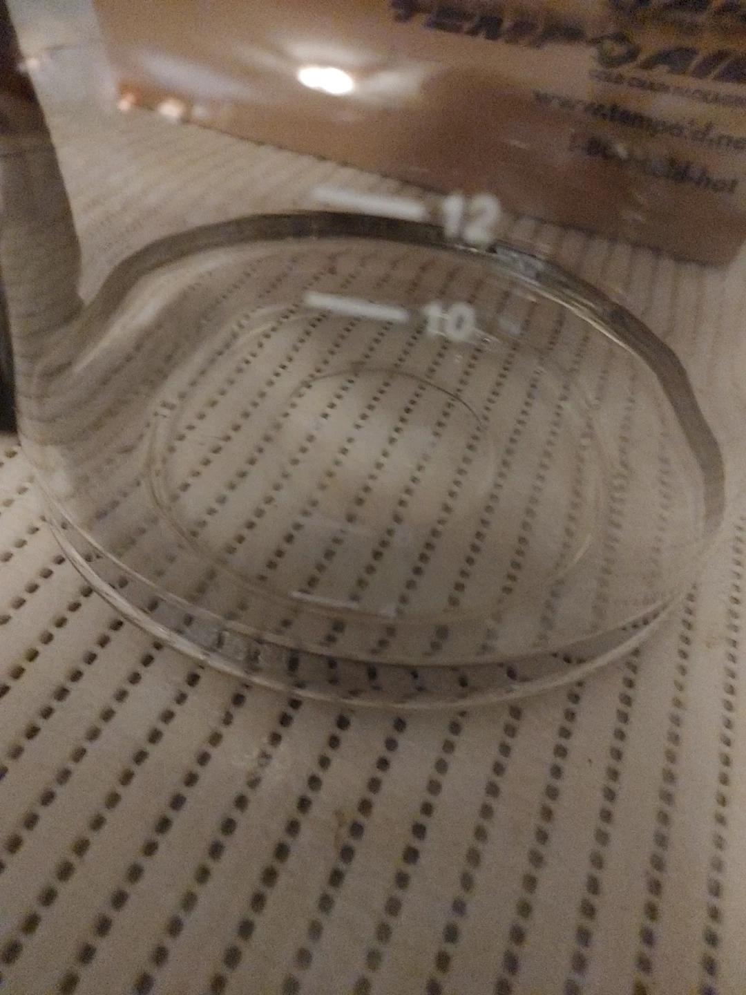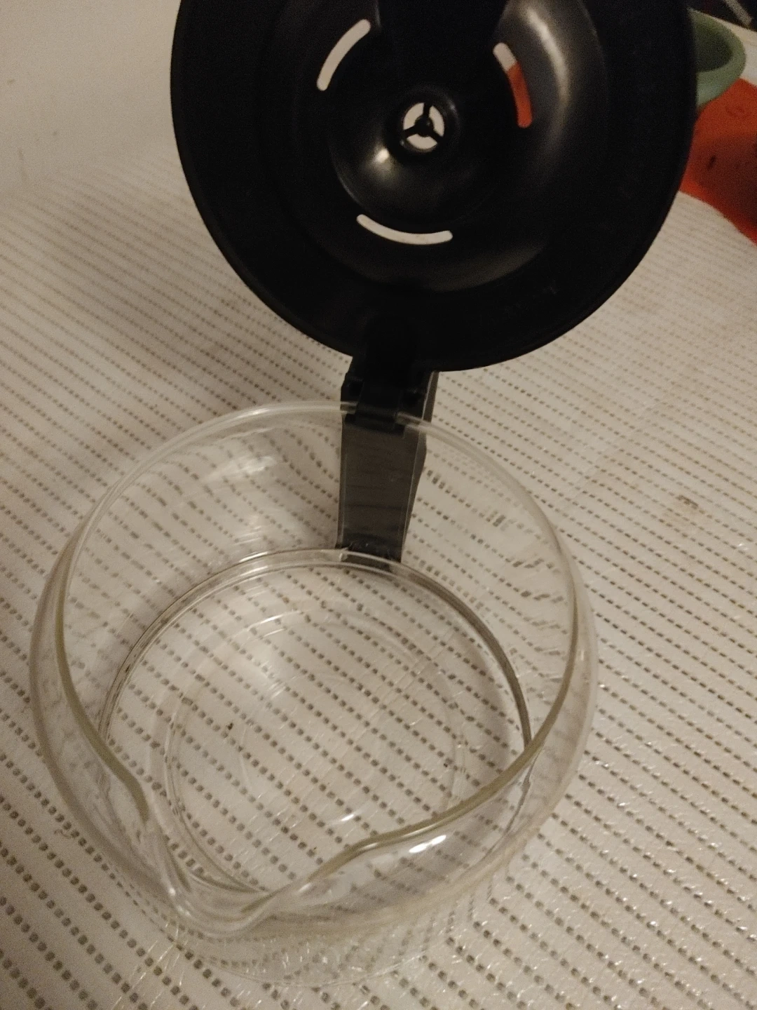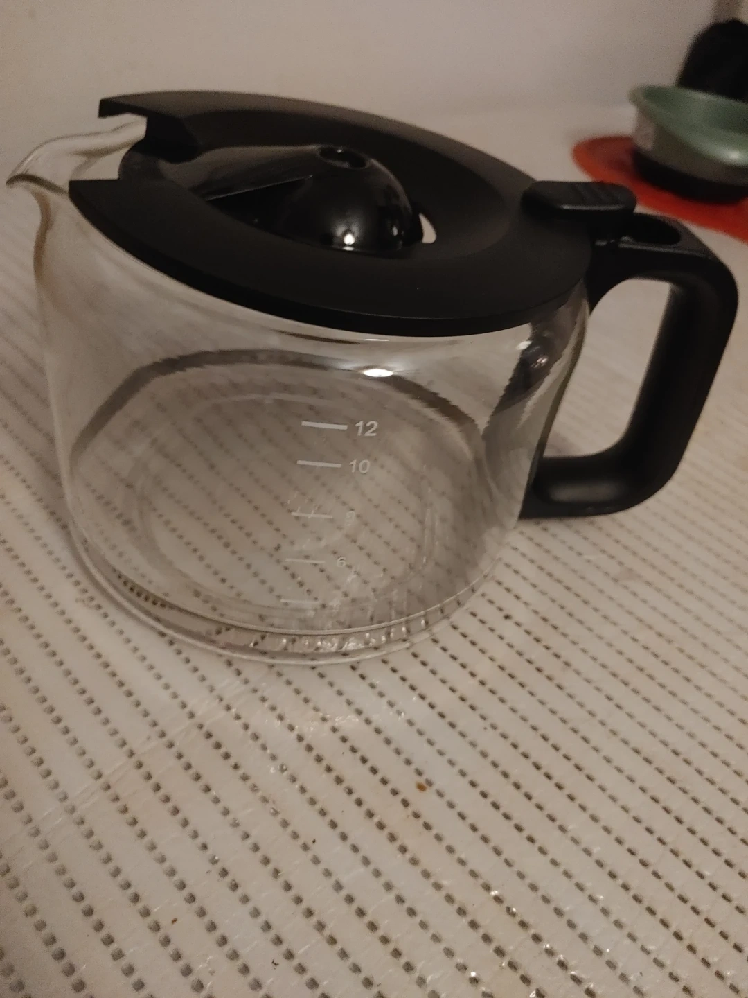 Glass coffee pot with a black lid and handle. It has measurement markings up to 12 cups. Perfect for replacing a broken carafe!