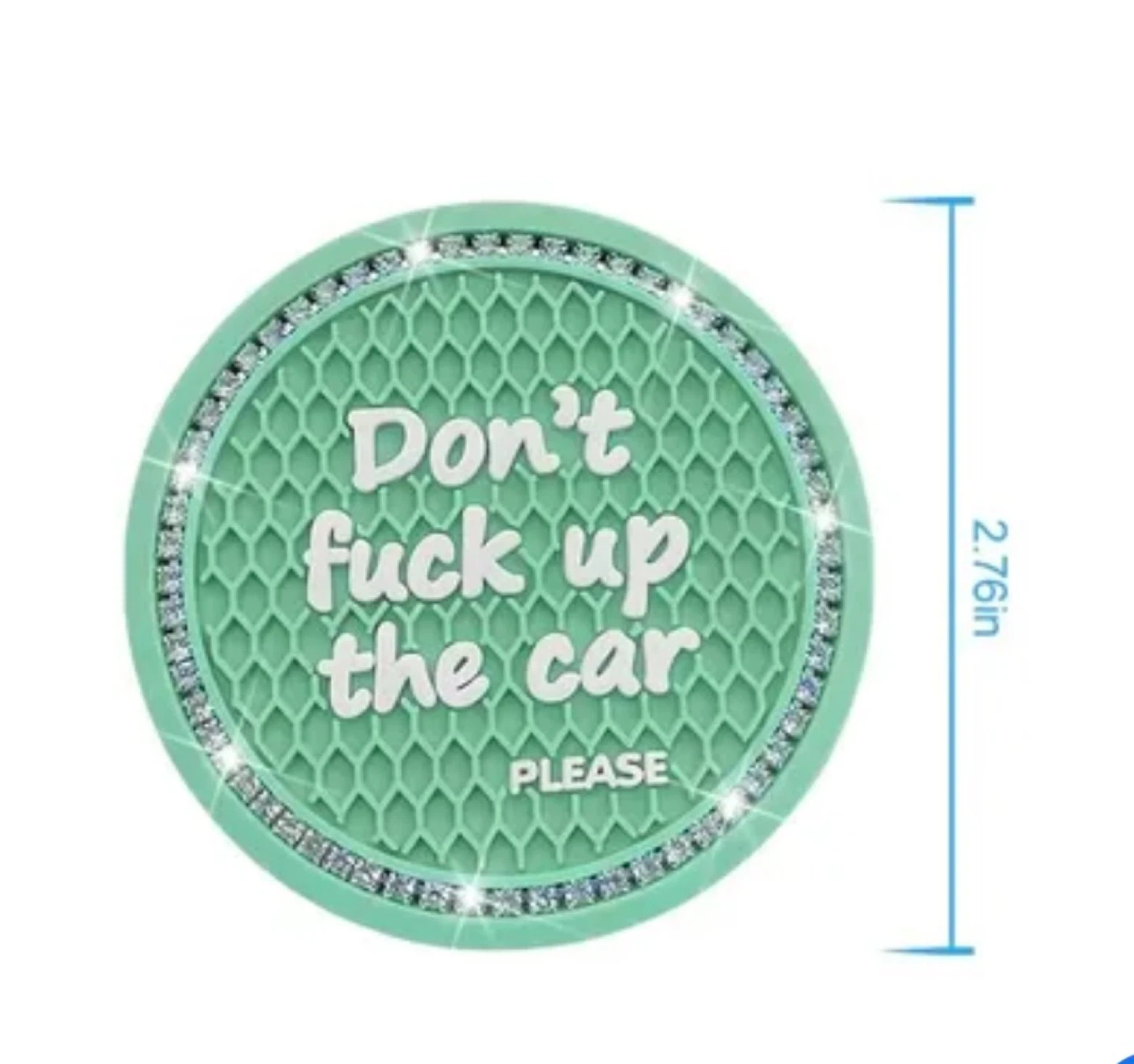 Set of two green car coasters with diamond trim and 'Don't fuck up the car' text. Measures 2.76 inches in diameter. Made of silicone material.