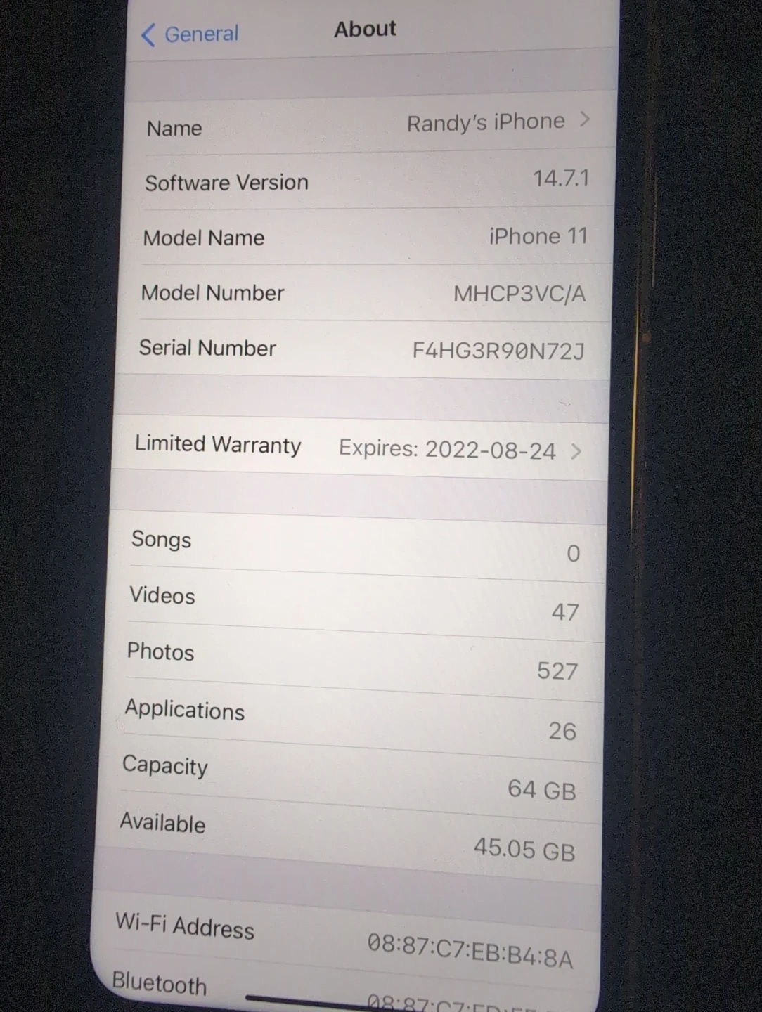 Apple iPhone 11 with 64 GB storage. It's running software version 14.7.1. Available storage is 45.05 GB.