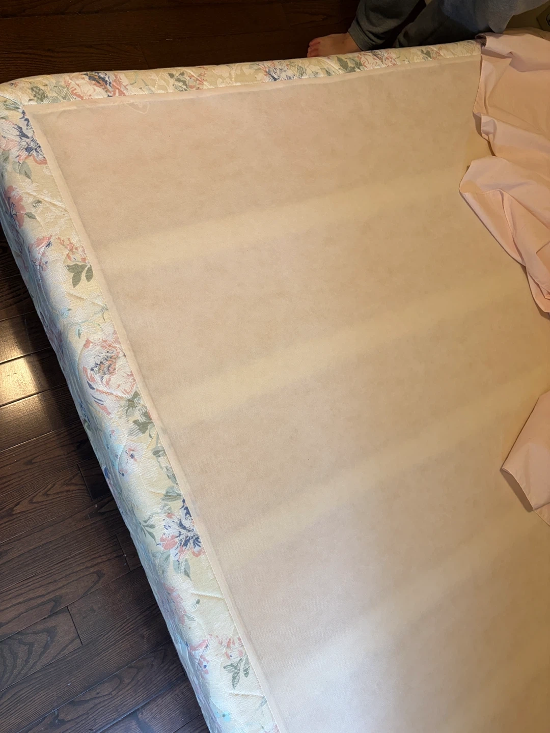 Queen size mattress with a floral pattern. It's made with Polyurethane Foam/Foam and polyester fibers. This mattress has a box spring base with a floral fabric.
