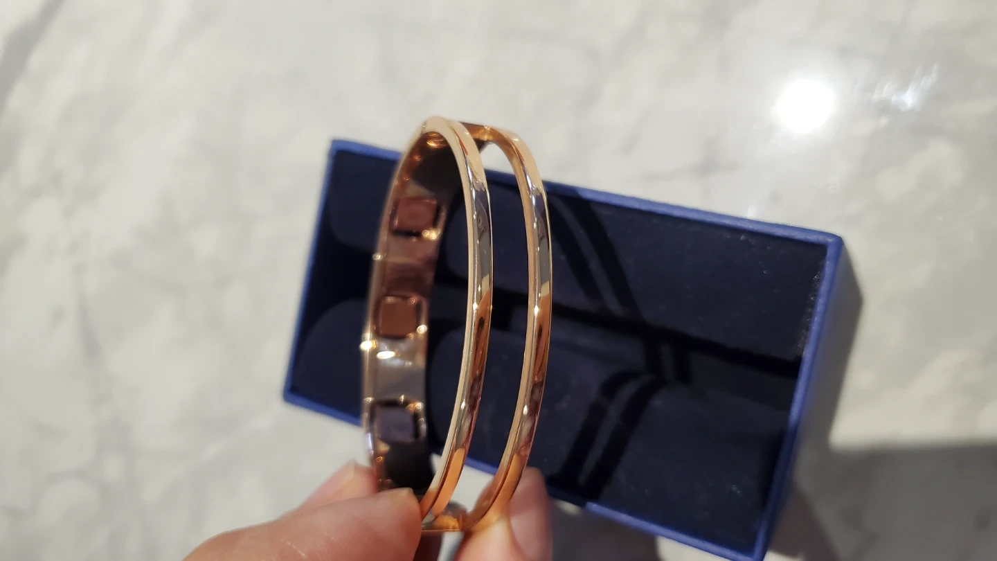 A rose gold tone bangle bracelet from Swarovski. It's embellished with clear crystals. Includes the original Swarovski box.