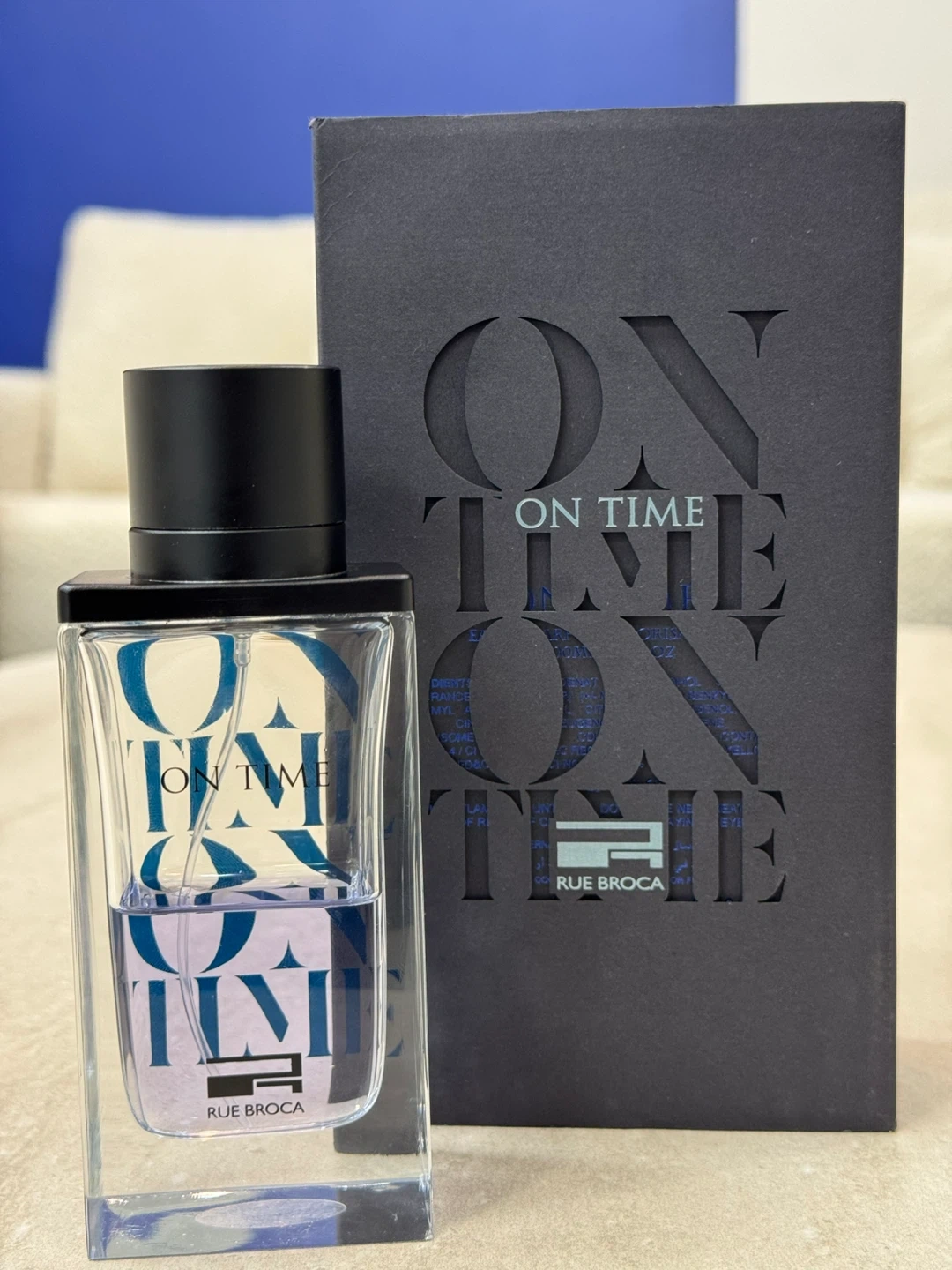 This is the On Time fragrance by Rue Broca. It's a sophisticated scent housed in a clear glass bottle with a black cap. The fragrance comes with its original dark packaging.