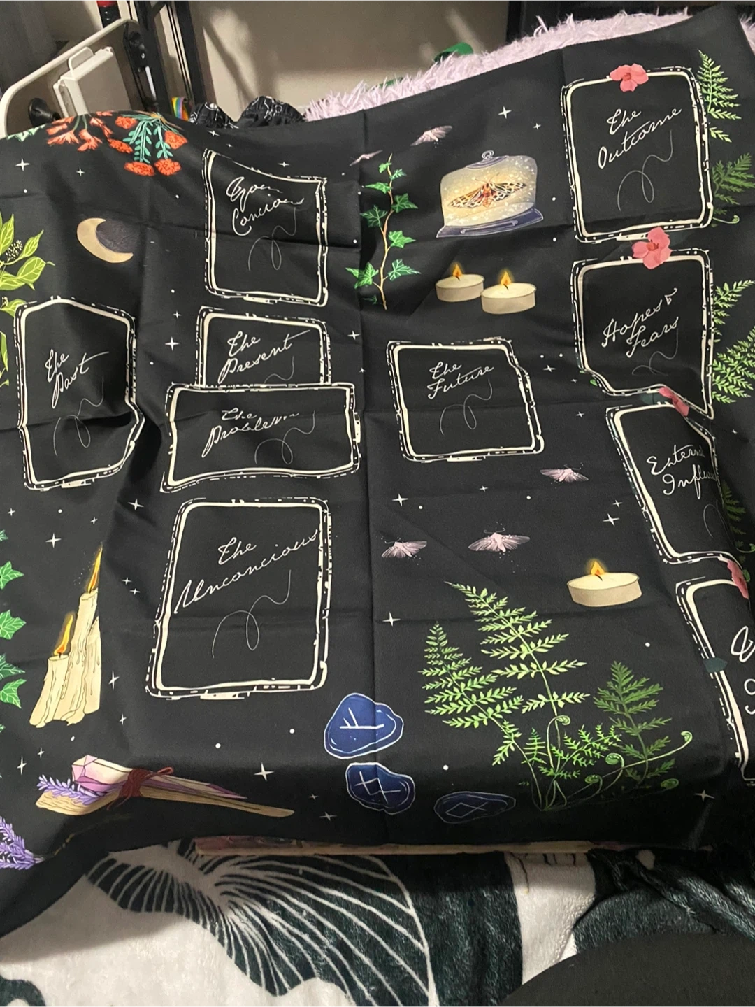 This black tarot cloth features a mystical design with cards for 'The Past', 'The Present', 'The Future', 'The Conscious', 'The Unconscious', 'The Outcome', and 'Hopes & Fears'. It's decorated with celestial elements like a moon and stars, along with candles, ferns, and runes. Perfect for your divination or ritual space!