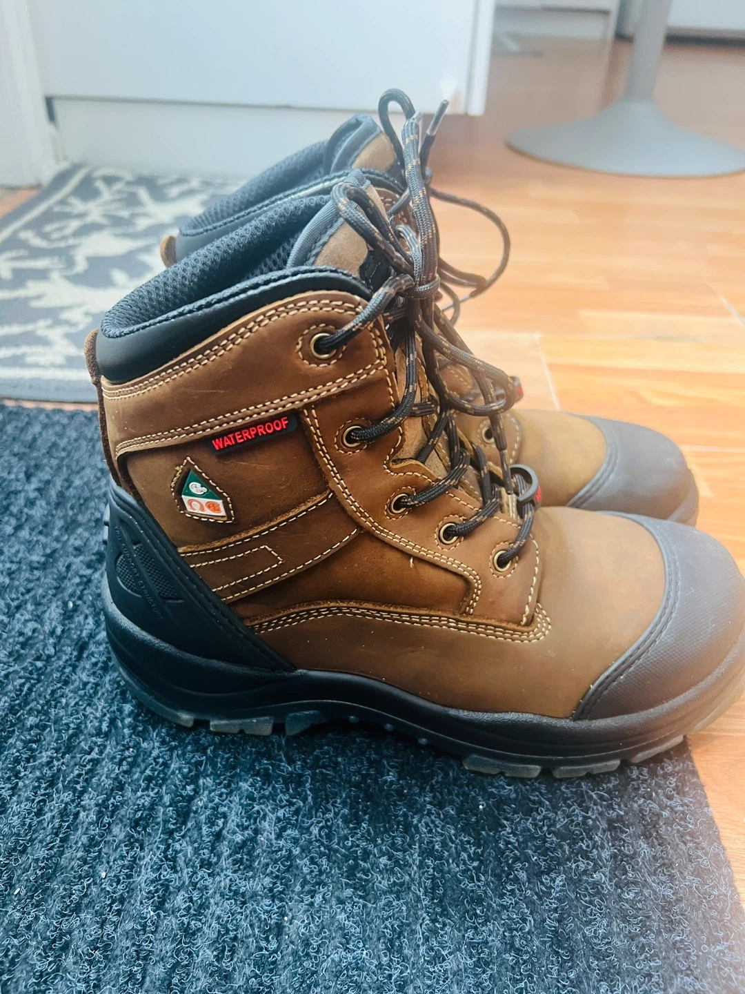 Oakley work boots with a steel toe and waterproof exterior. These boots are designed for protection and durability on the job. They feature a classic brown leather and black synthetic design.