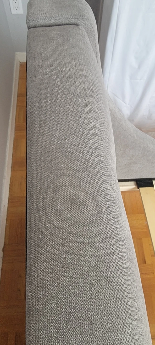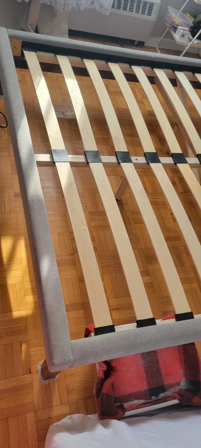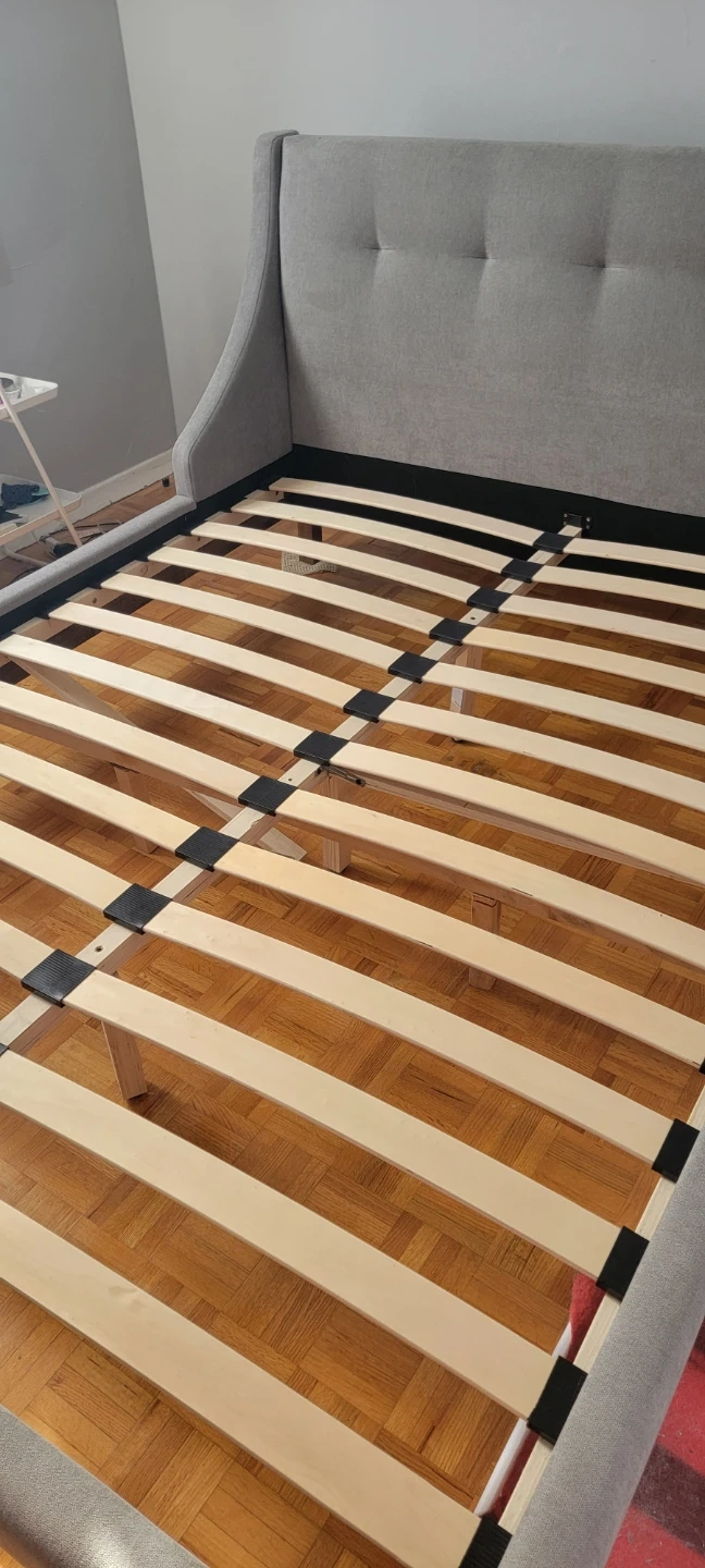 This upholstered bed frame comes with a stylish grey fabric and a tufted headboard. It includes wooden slats for mattress support. It's a queen-sized bed frame.