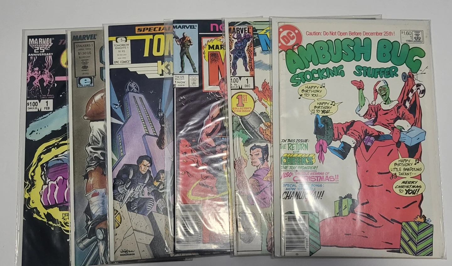 A collection of assorted Marvel and DC comic books. This lot includes The Comet Man, Mark Hazzard: Merc, The Marvel Saga, and Ambush Bug Stocking Stuffer. Comic books are a fun read for collectors and fans! All First issues, all NM condition.