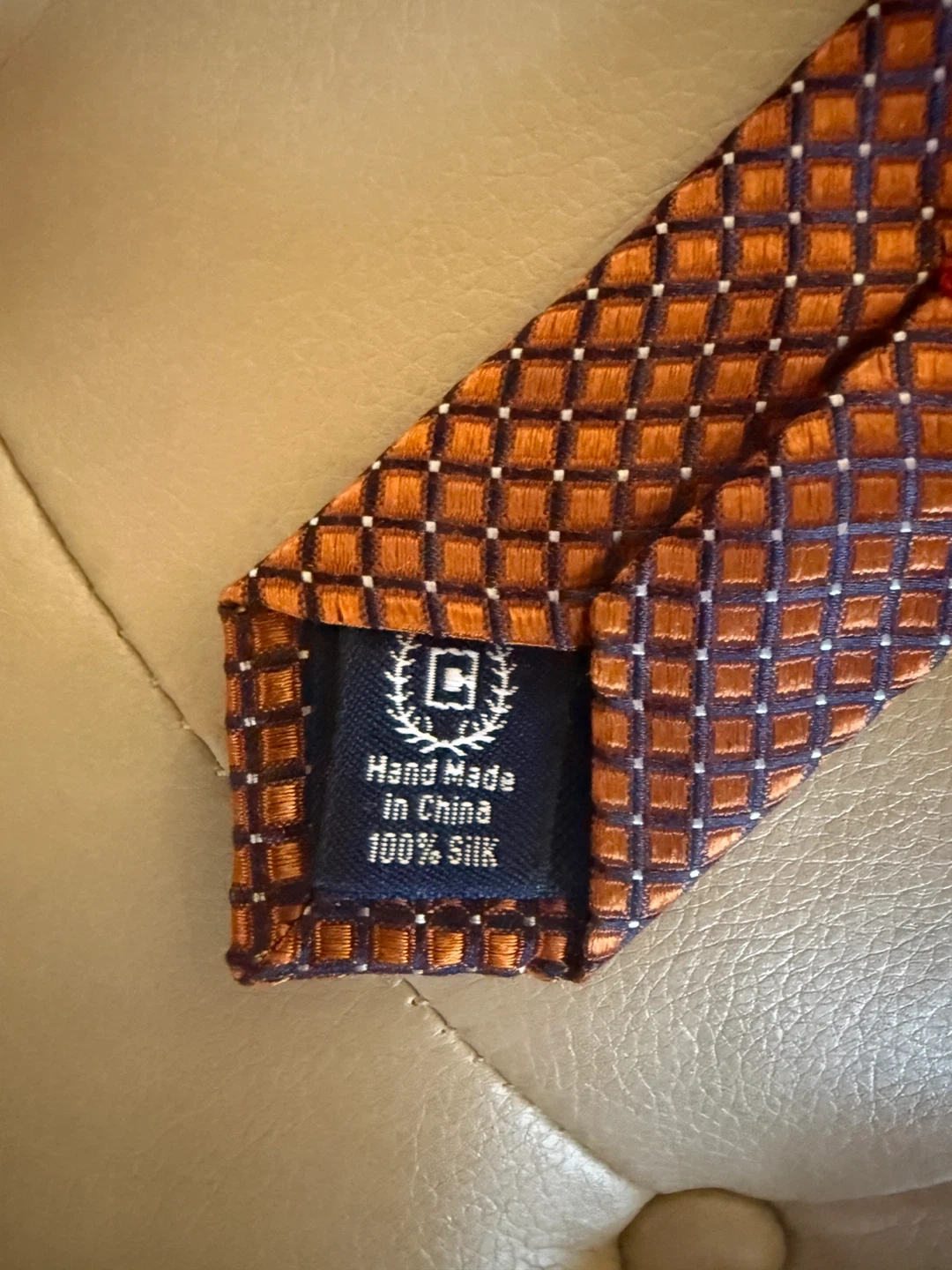 This is a Chaps brand men's necktie. It's made of 100% silk. Hand-made in China. This tie's pattern makes it suitable for formal or business casual wear.