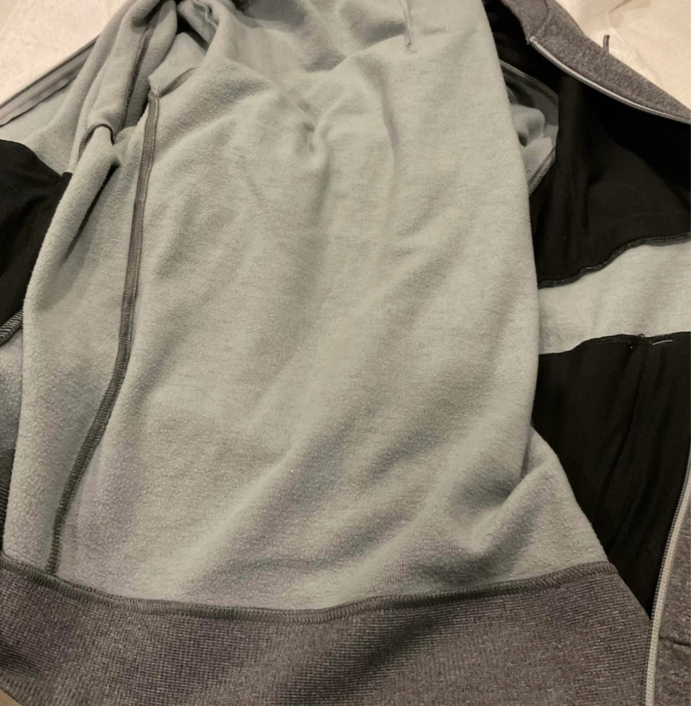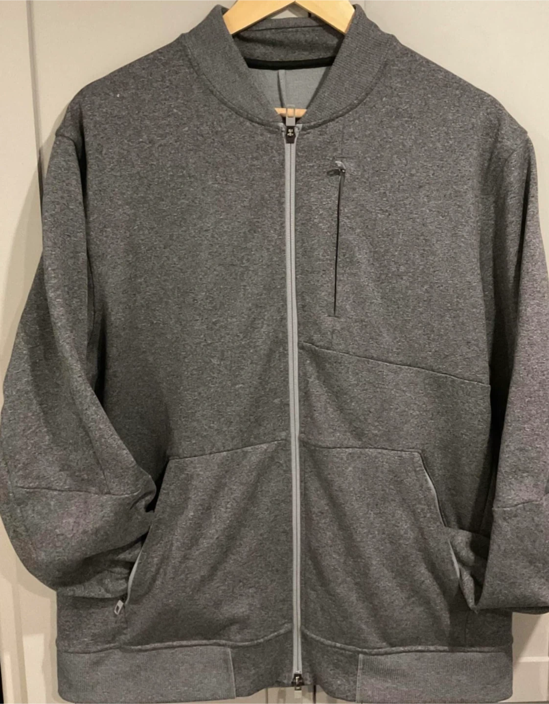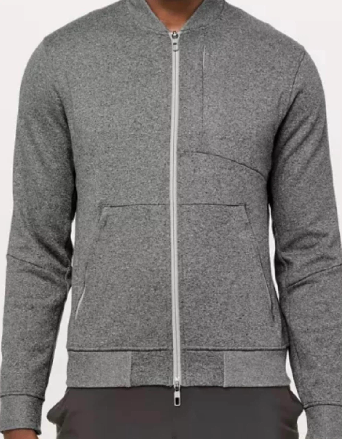 Lululemon men’s commute bomber jacket in heather grey. Size L. Full zip front with two hand pockets and one zippered chest pocket. Ribbed cuffs and hem.
