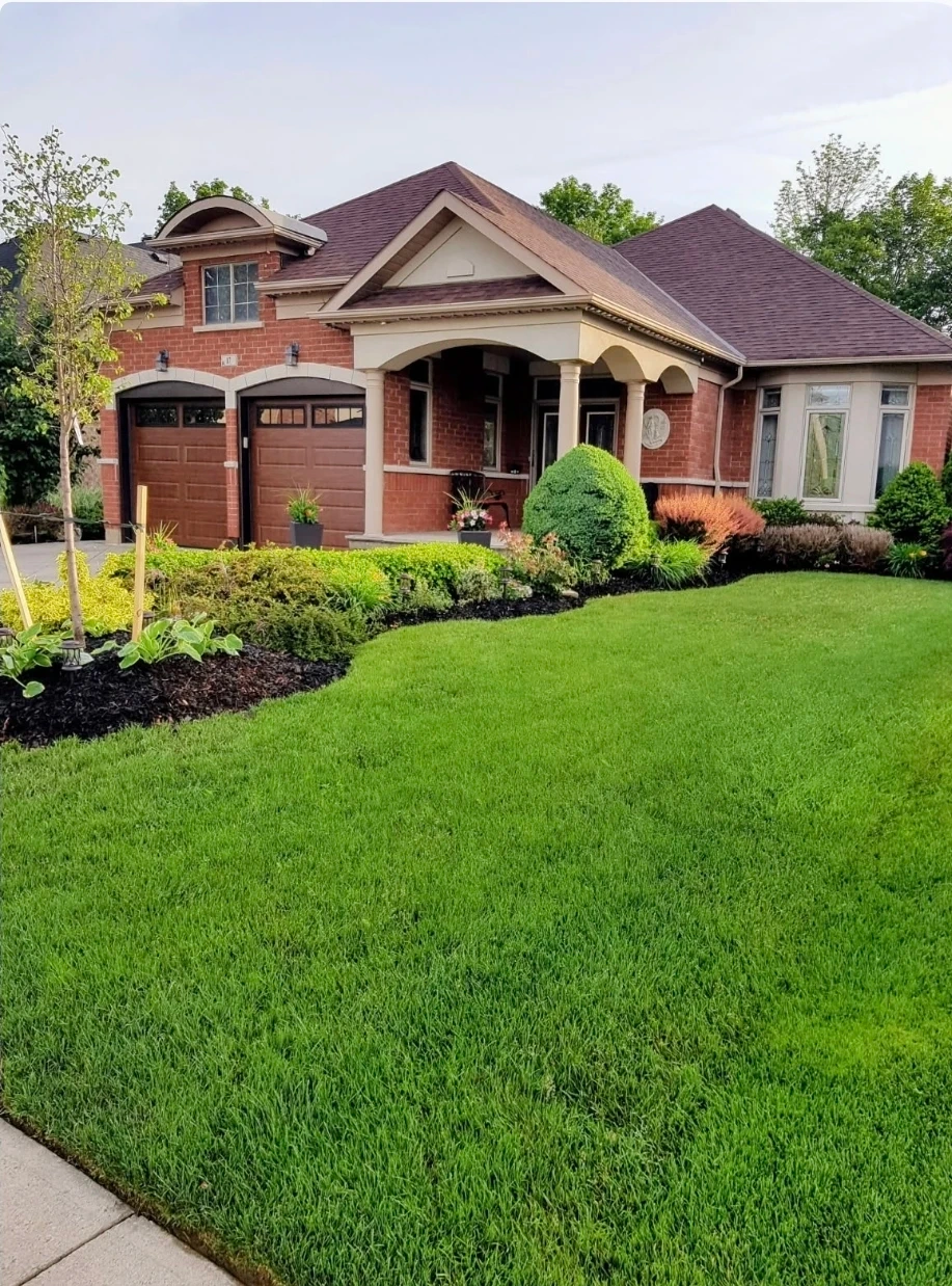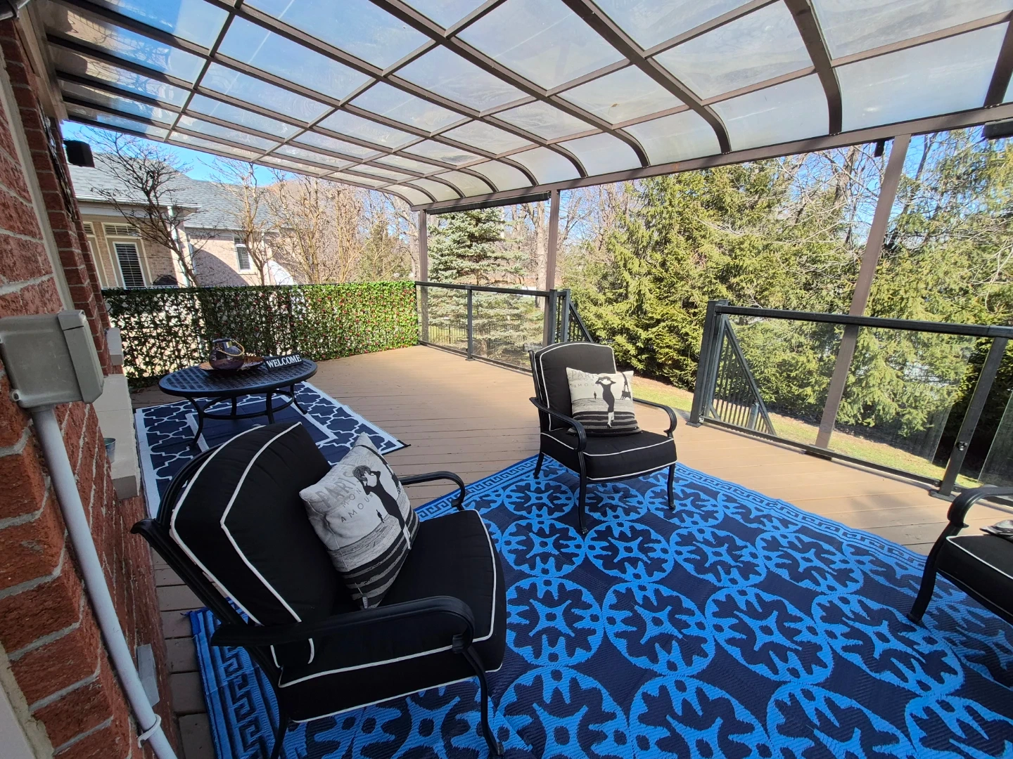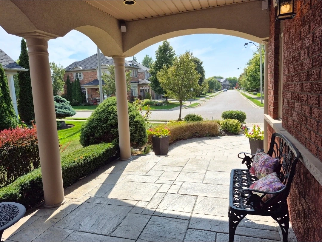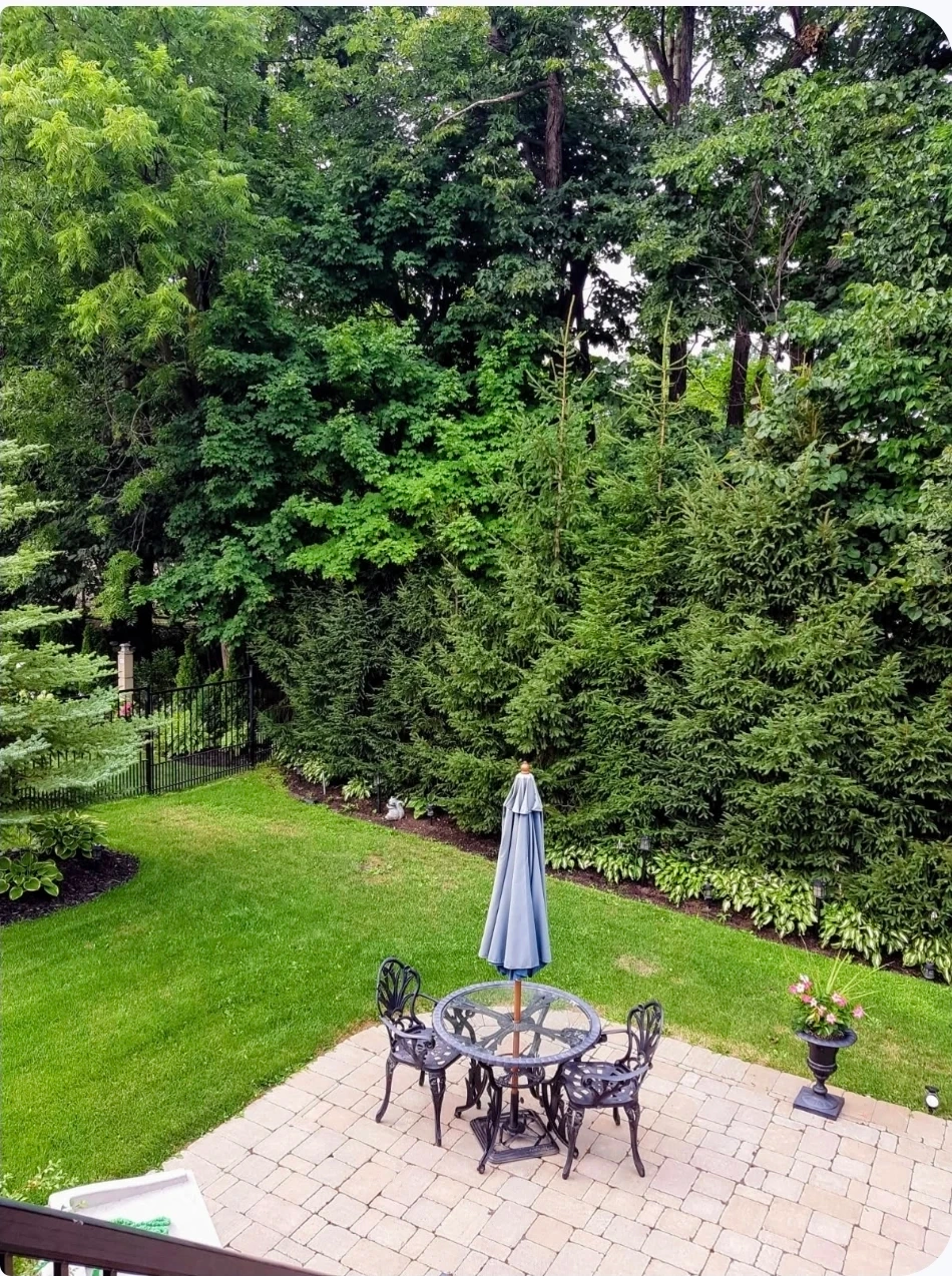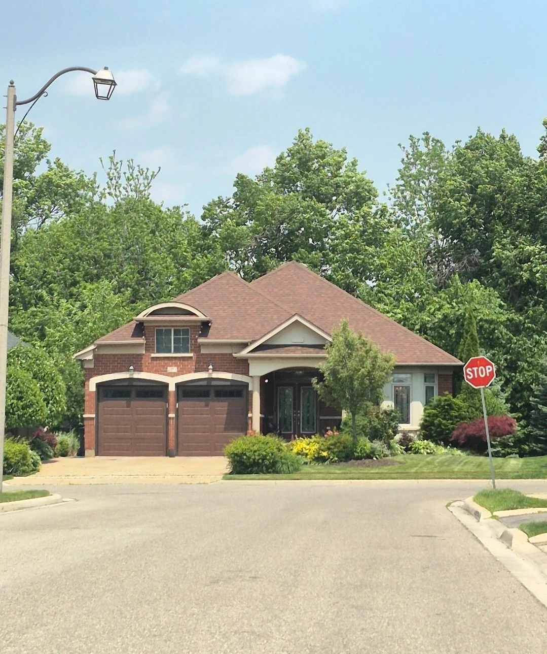 Beautiful brick home with a well-maintained lawn and mature trees. Features a spacious backyard with a patio area and outdoor seating. Includes a double garage and a covered front porch. Located on a quiet, tree-lined street.