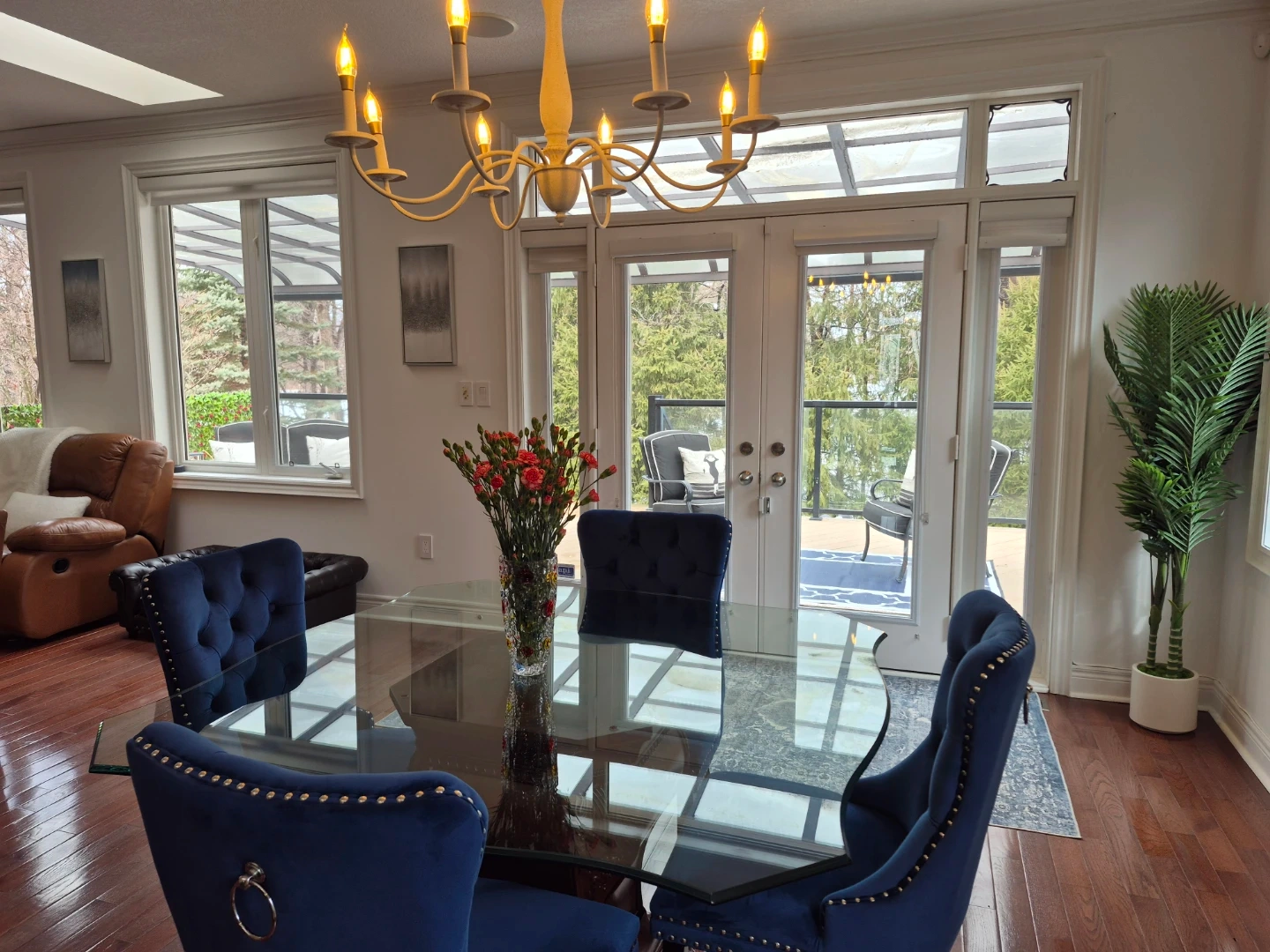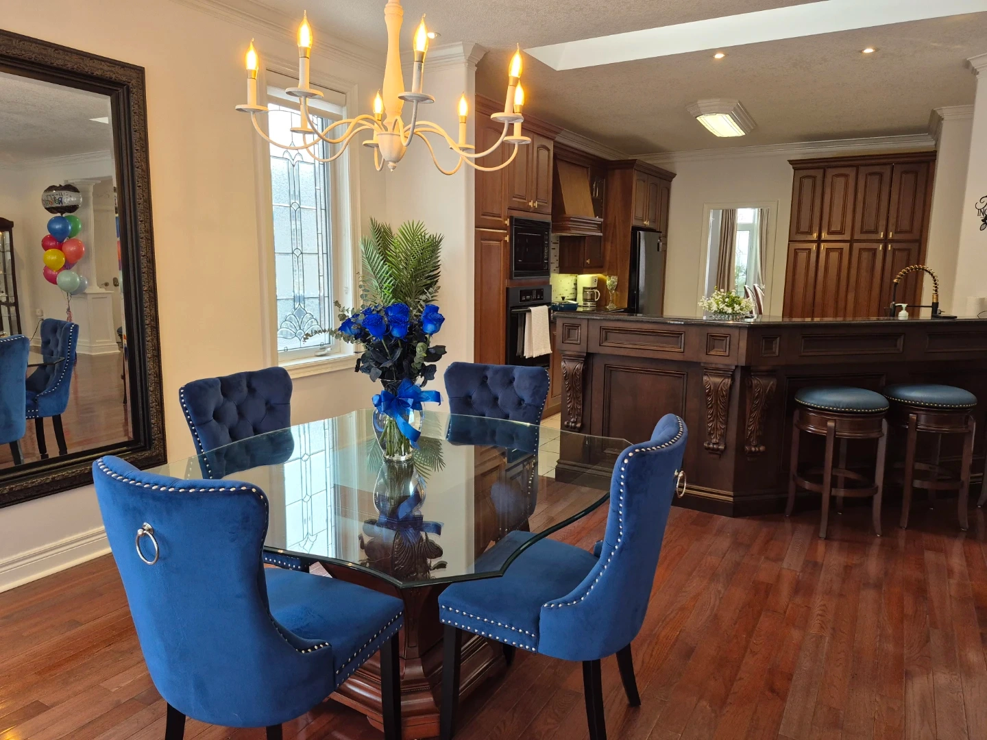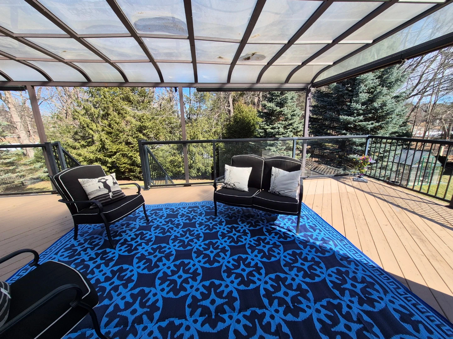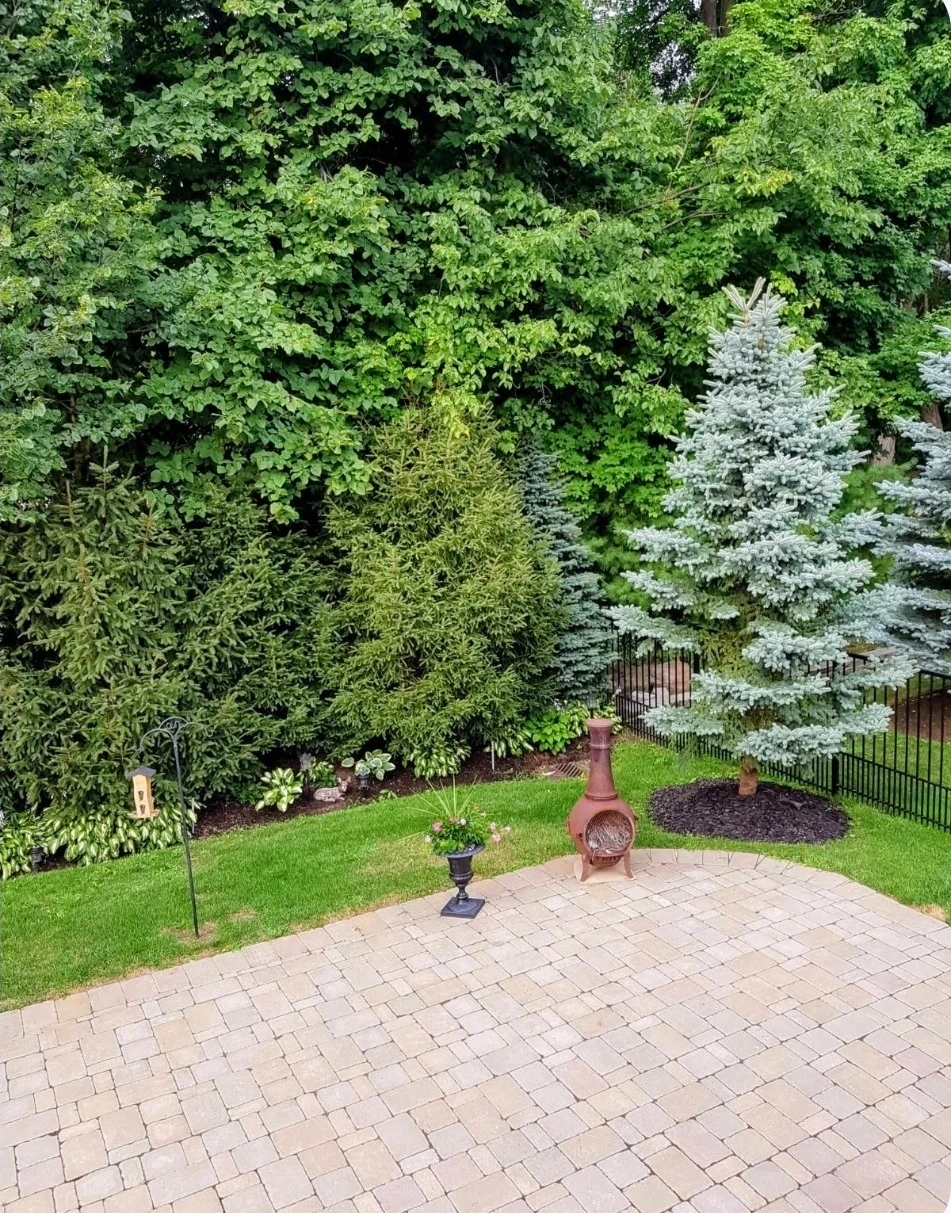 Beautiful brick home with a well-maintained lawn and mature trees. Features a spacious backyard with a patio area and outdoor seating. Includes a double garage and a covered front porch. Located on a quiet, tree-lined street.