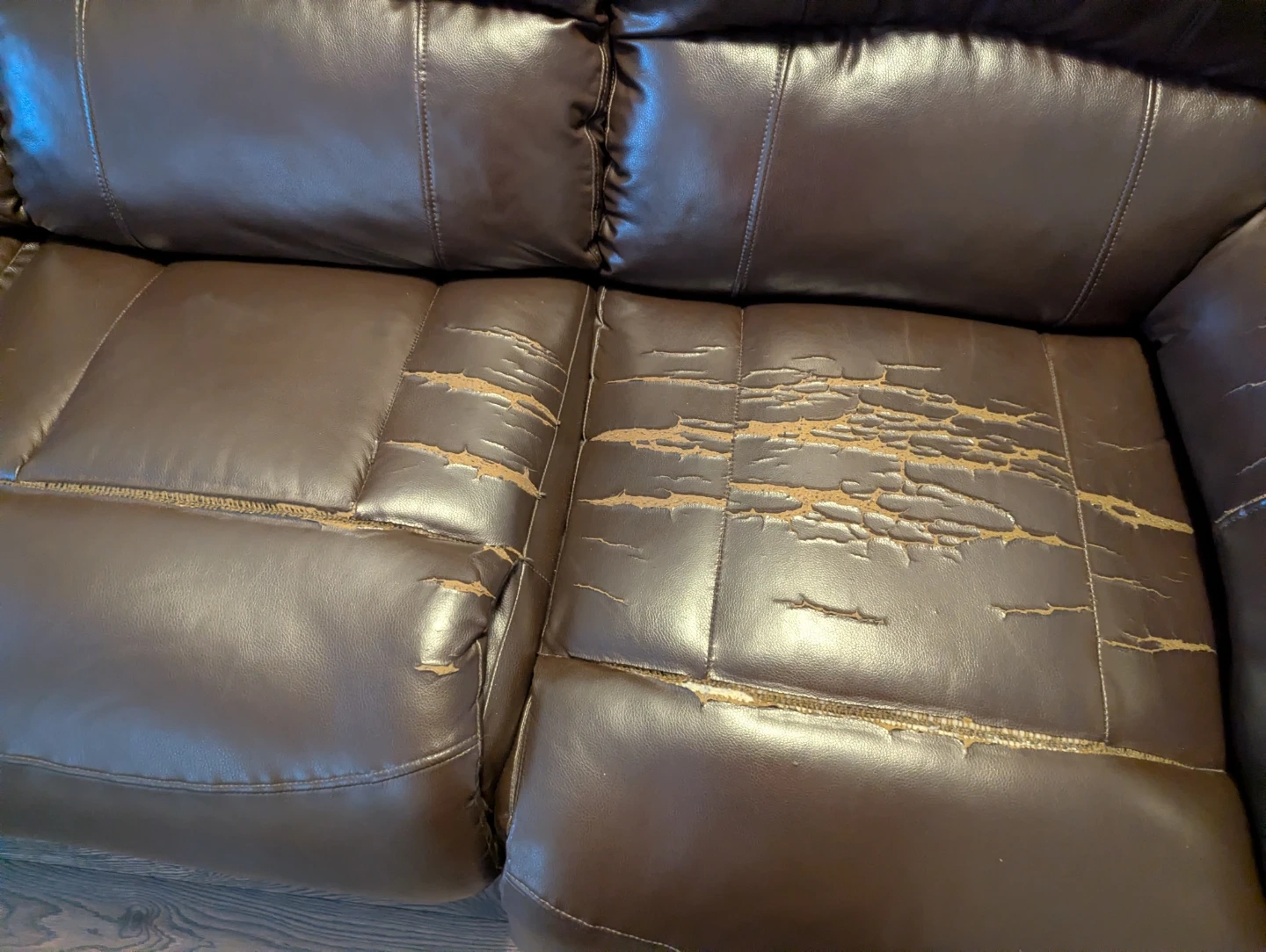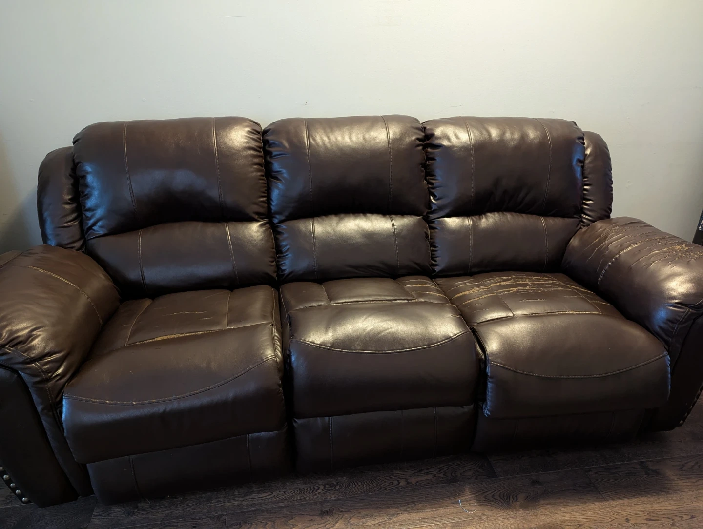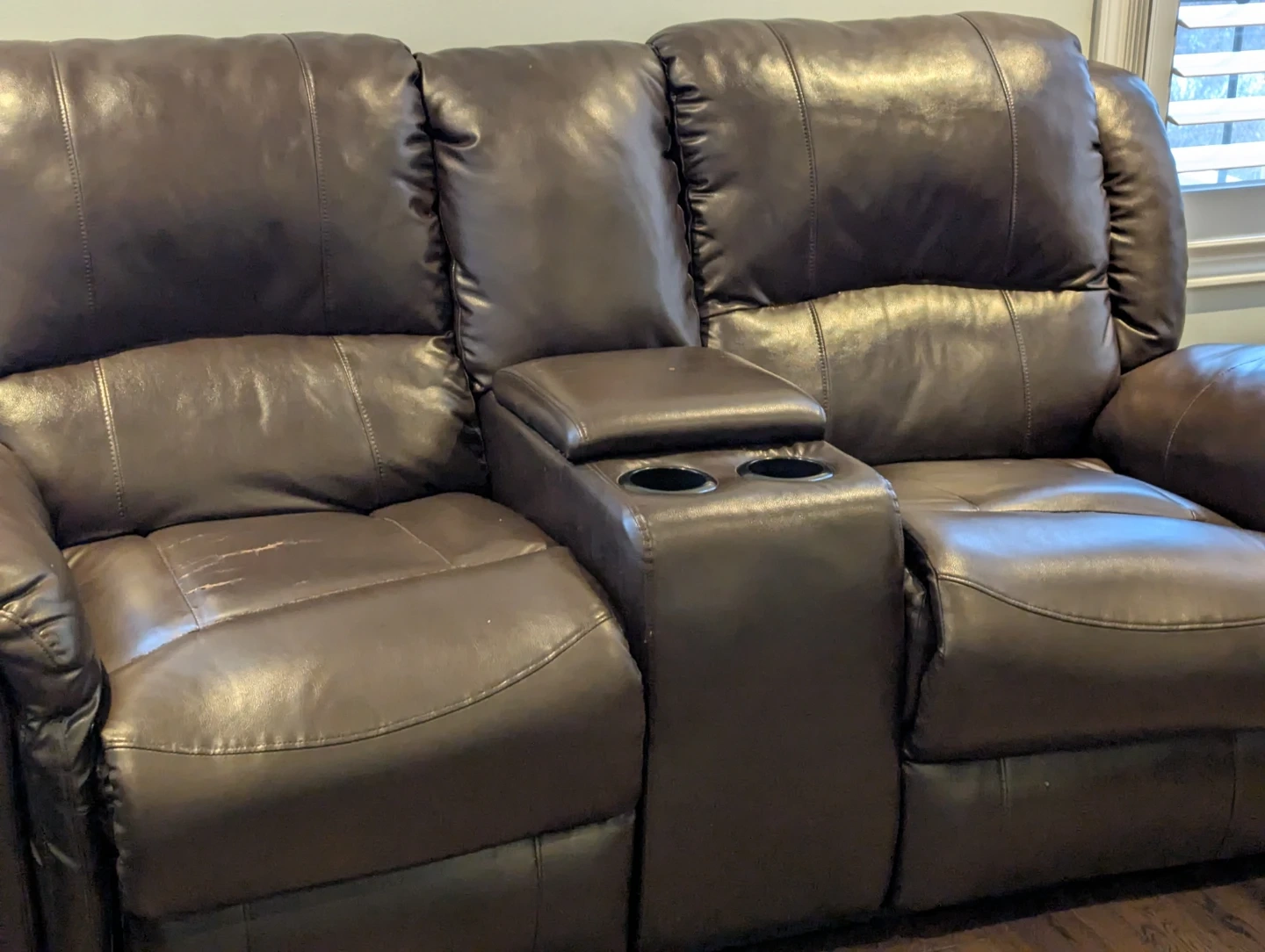 Brown reclining sofa with faux leather upholstery and a centre console featuring two cupholders. It's a three-seater with reclining seats. Some wear and tear on the seat cushions and top of the backrest. This sofa would be useful for a basement family room or a starter home.