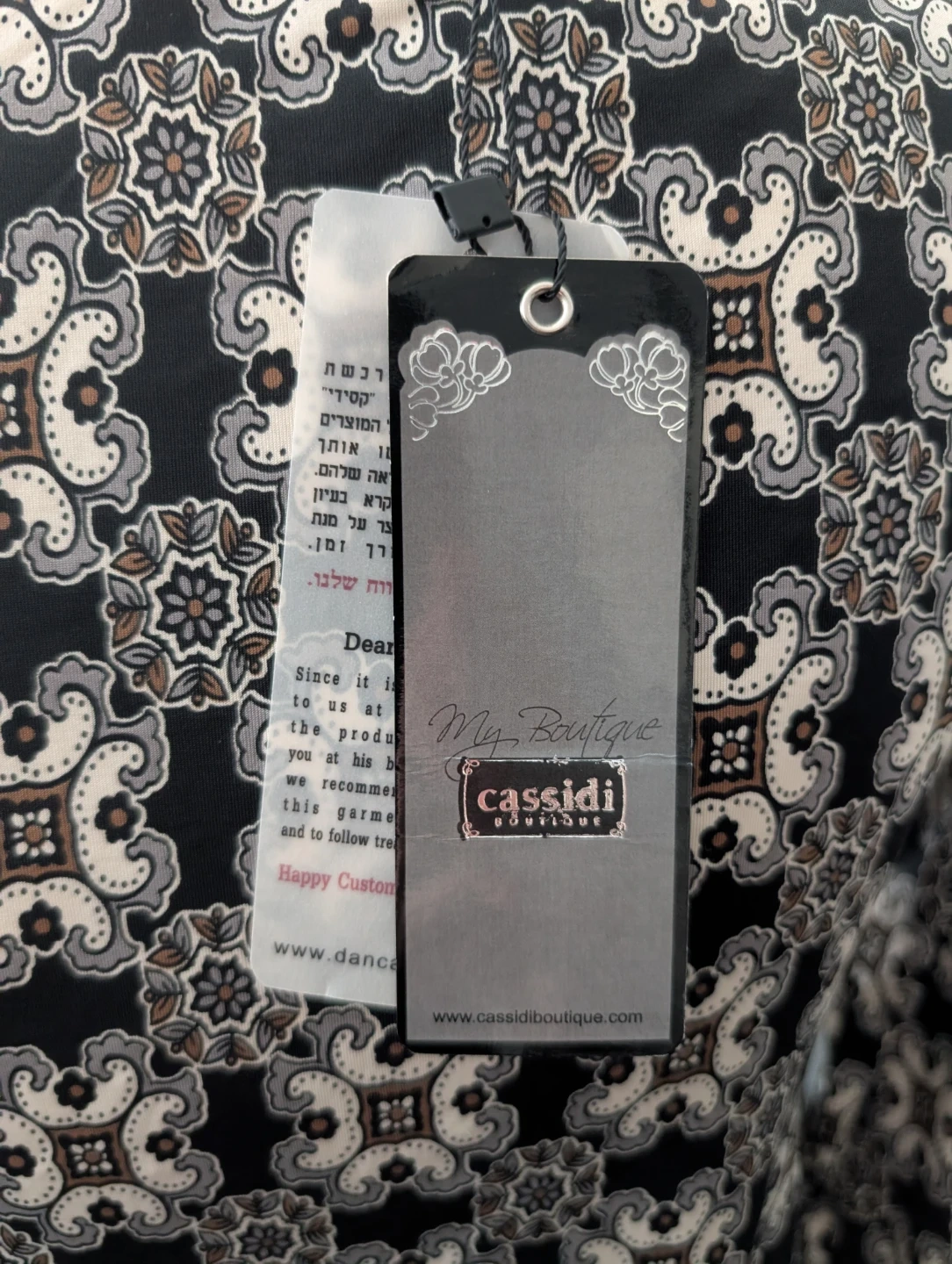 Cassidi Boutique long sleeve maxi dress with a dark floral pattern. Made with 95% polyester and 5% lycra. Garment care instructions include gentle wash at 30 degrees. Made in Israel.
