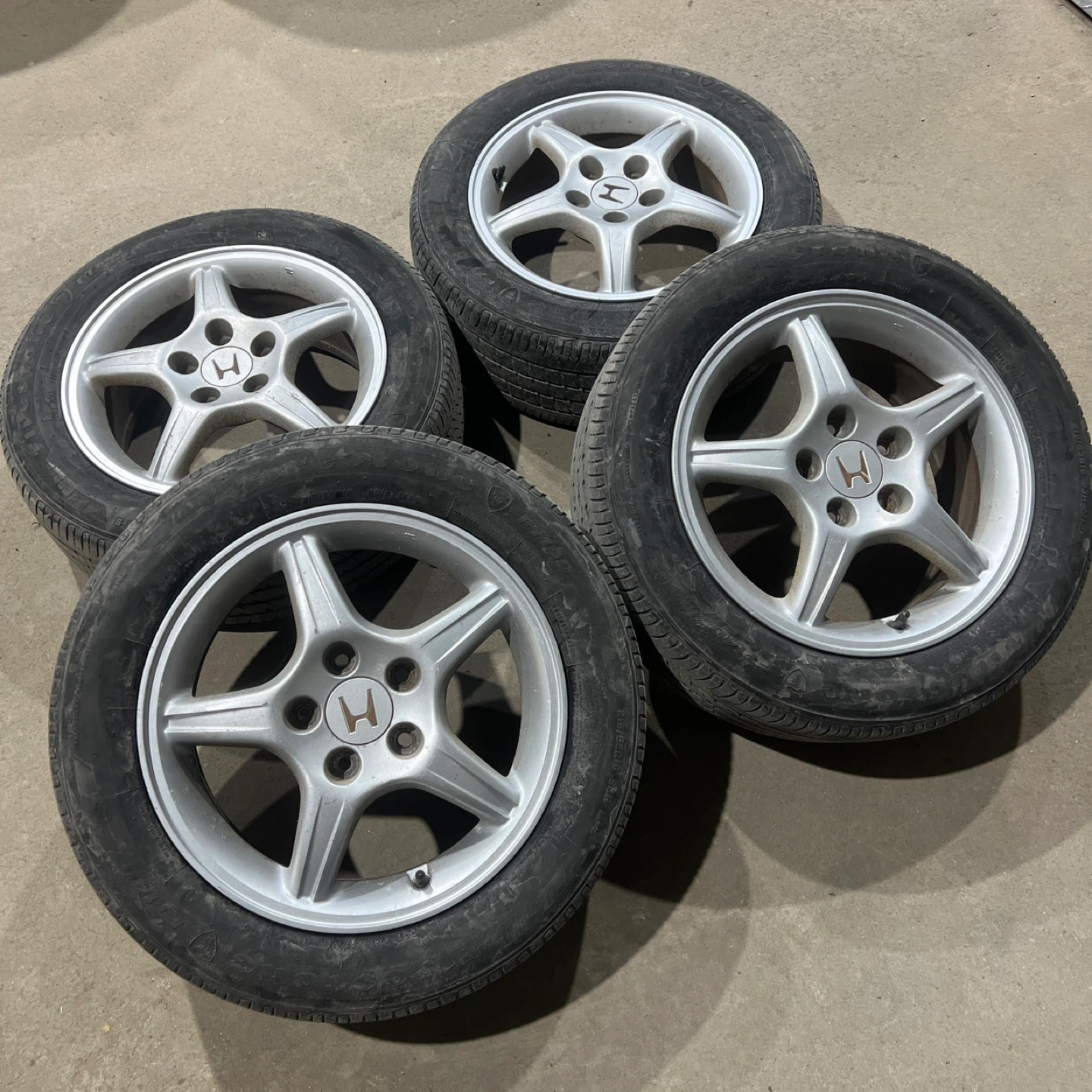Set of four 215/55/16 all season tires mounted and balanced on OEM Honda aluminum alloy wheels 5x114.3 64.1 for Honda Civic. Tires have about 50% tread, enough for one season.