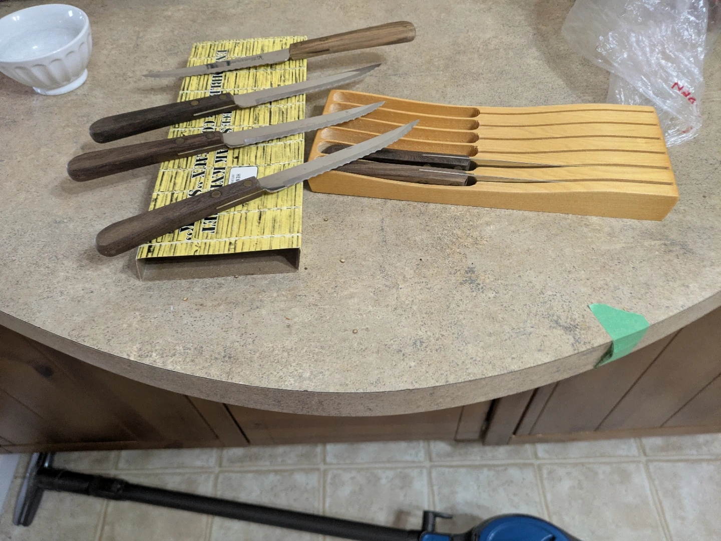 This set includes four serrated steak knives with dark wood handles. It also comes with a light wood block holder designed to store the knives. The knives feature stainless steel blades. This set is perfect for dinner parties or everyday use!