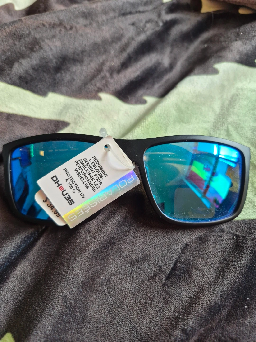 Polarized sunglasses with UV protection for enhanced visual performance. Reduces glare for clearer vision. Features a black frame with blue mirrored lenses. Bought for $34.99.