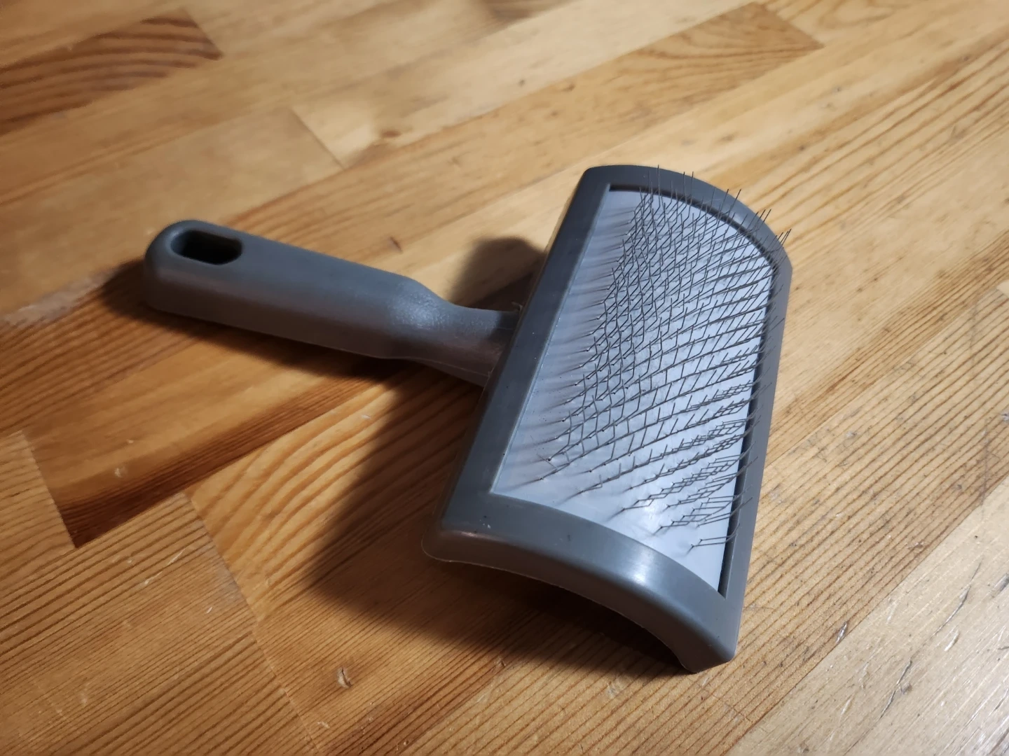Curved Slicker Brush, a staple for pet grooming. While the exact brand isn't printed on the plastic, this specific design—characterized by the grey textured handle, the reinforced "grid" on the back, and the bent metal pins. Designed as a generic professional-grade groomer's slicker.