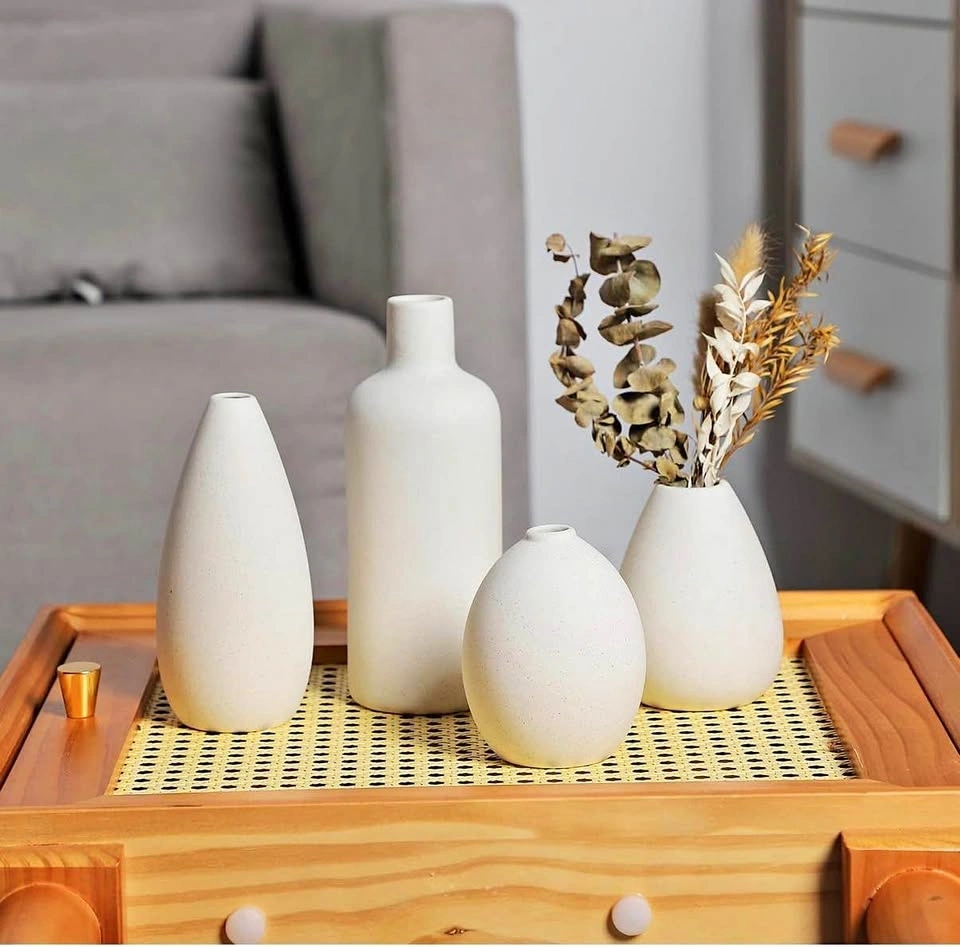Modern set of 4 ceramic vases. These white vases have a cool speckled finish and come in different shapes. Perfect for fresh flowers or dried arrangements. Pick up from Etobicoke or downtown Union Station.