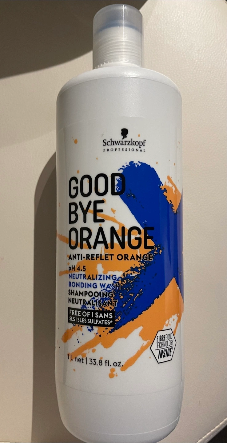 Selling a bottle of Schwarzkopf Professional Goodbye Orange anti-orange effect neutralizing bonding wash shampoo. It's pH 4.5 and free of SLS/SLES sulfates. Contains Fibre Bond Technology. Bottle contains 1L / 33.8 fl oz