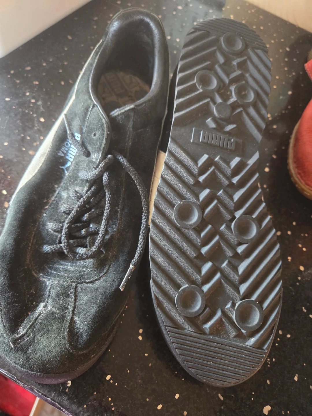 Puma Roma sneakers in a black suede material. They feature a classic lace-up design with the Puma logo on the sole. These shoes are great for everyday wear.