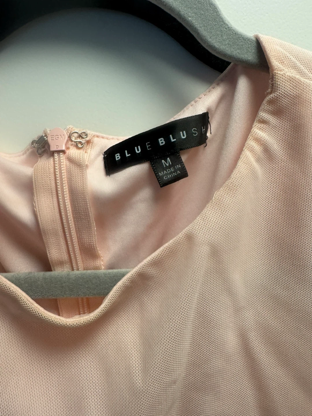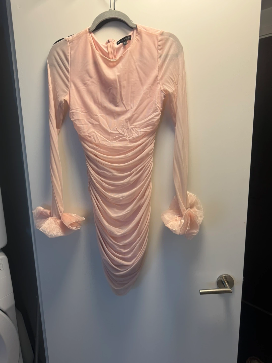 This is a pale pink ruched mesh dress from Blue Blush. It's a size medium with long sheer sleeves and a crew neck. The ruching adds a flattering silhouette to this party-ready dress!