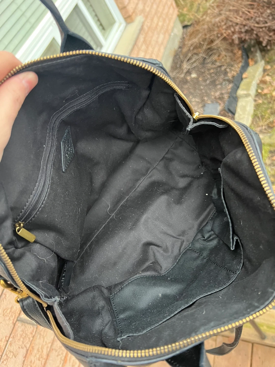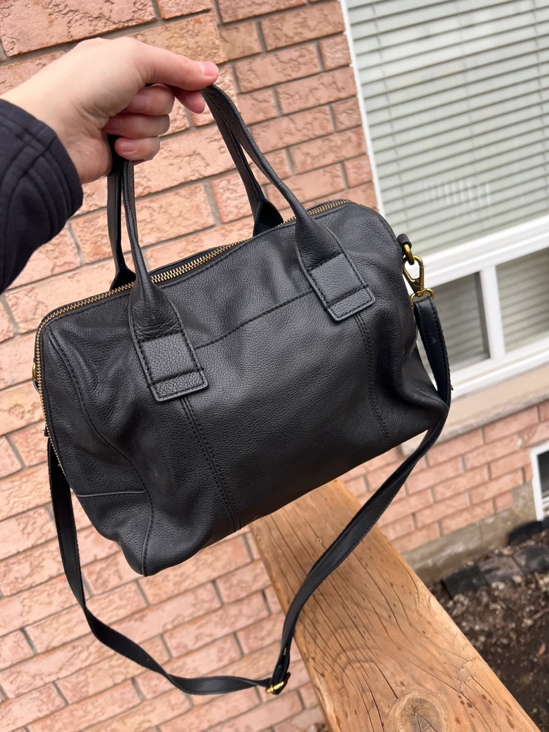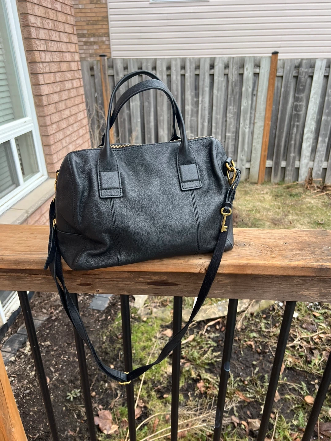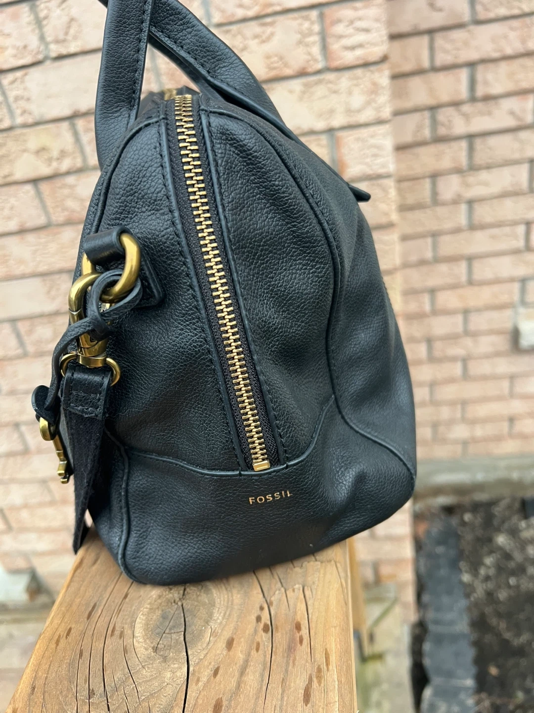 This black leather handbag from Fossil is a versatile accessory. It features a spacious interior with zippered pockets. Includes a detachable shoulder strap for comfortable carrying.
