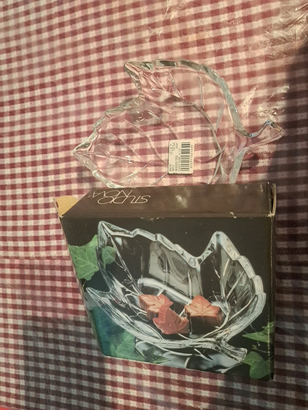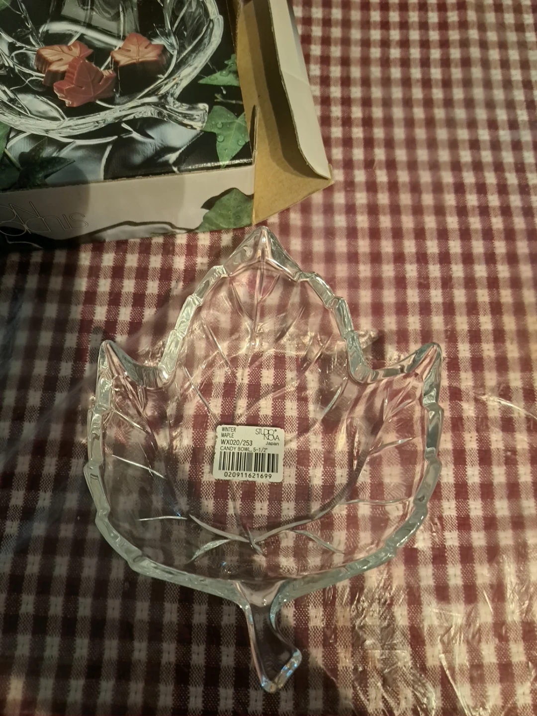 Brand new Studio Nova glass candy bowl in a maple leaf shape. It's 14cm in size. Comes with original box.