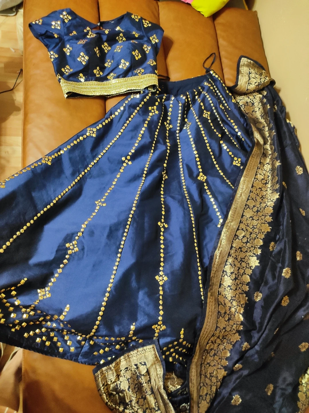 Beautiful navy blue lehenga choli set, complete with a matching dupatta. This outfit features intricate gold embroidery all over the skirt and blouse. It's made from a satin-like material for a lovely sheen. Perfect for special occasions and celebrations!