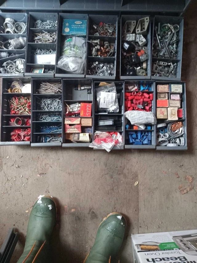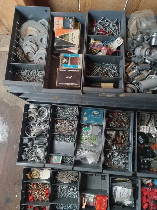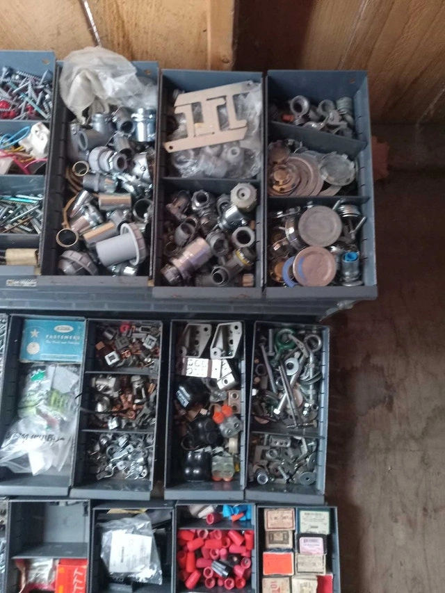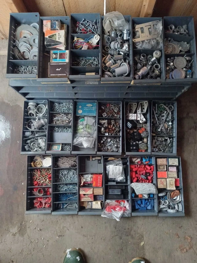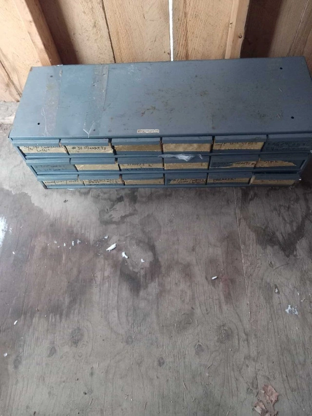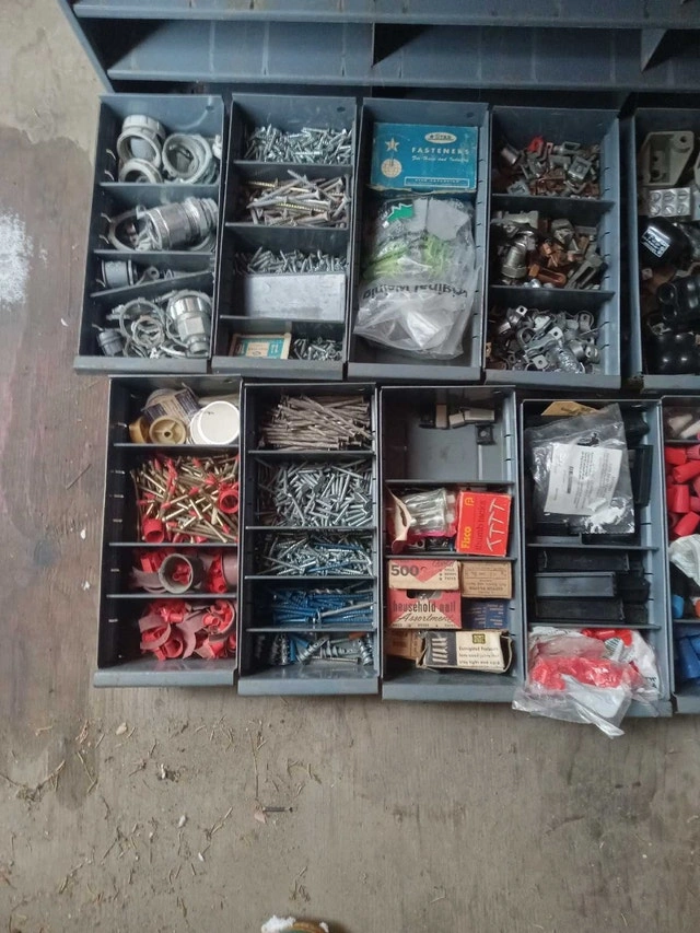 Was in a van, or could be great for a bench. Filled with material for electrical work. Dimensions are 34x11x12 inches. It should clean up, as far as bin markings, or you can just tape over them. I am open to offers, but a single item in here is over $10, and maybe the piece you need could be in your work or service situation. Cash accepted.
