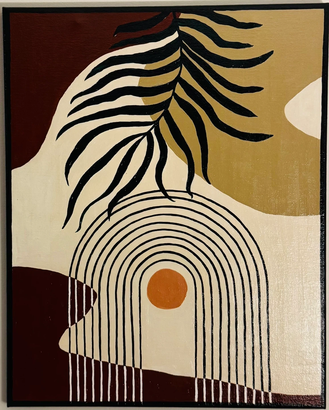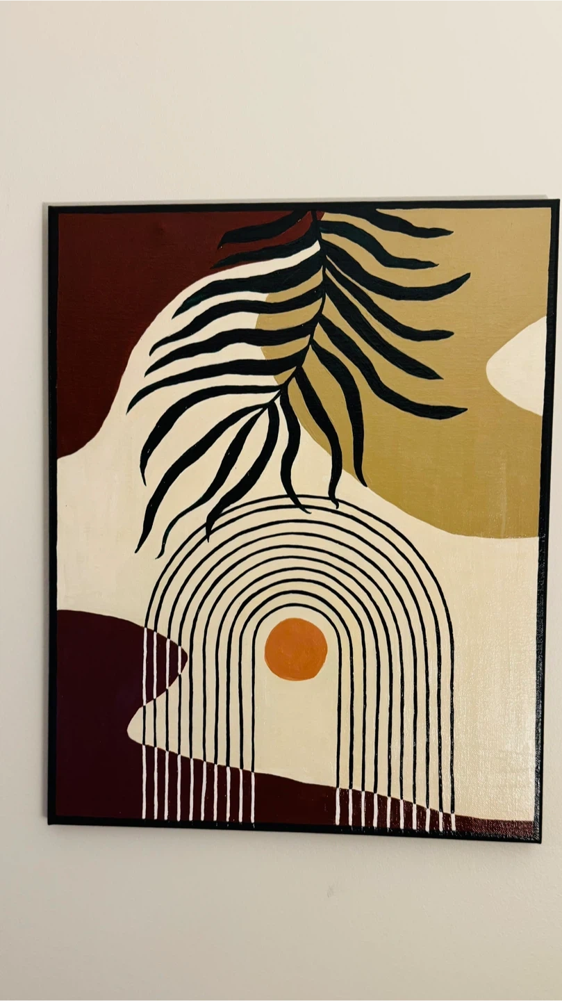 This sun-drenched botanical painting brings the feeling of a golden afternoon into any room. Two lush leaf stems reach upward around a bold arch, with a glowing terracotta sun anchoring the upper right — a composition full of balance, warmth, and life. Painted with professional acrylics on streched canvas, the piece has a grounded, organic quality that feels at home in boho, Japandi, and nature-inspired interiors alike. Display it alone as a focal point or alongside the companion pieces in this series for a cohesive, gallery-ready triptych.