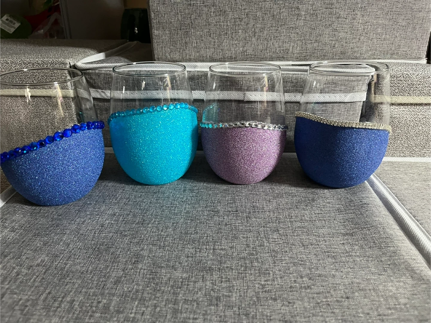 These four stemless wine glasses are uniquely decorated with glitter and rhinestones. They come in various sparkling colors like blue, teal, and purple. They're perfect for adding some sparkle to your next gathering!