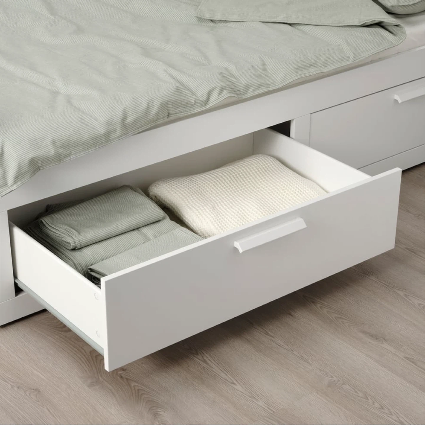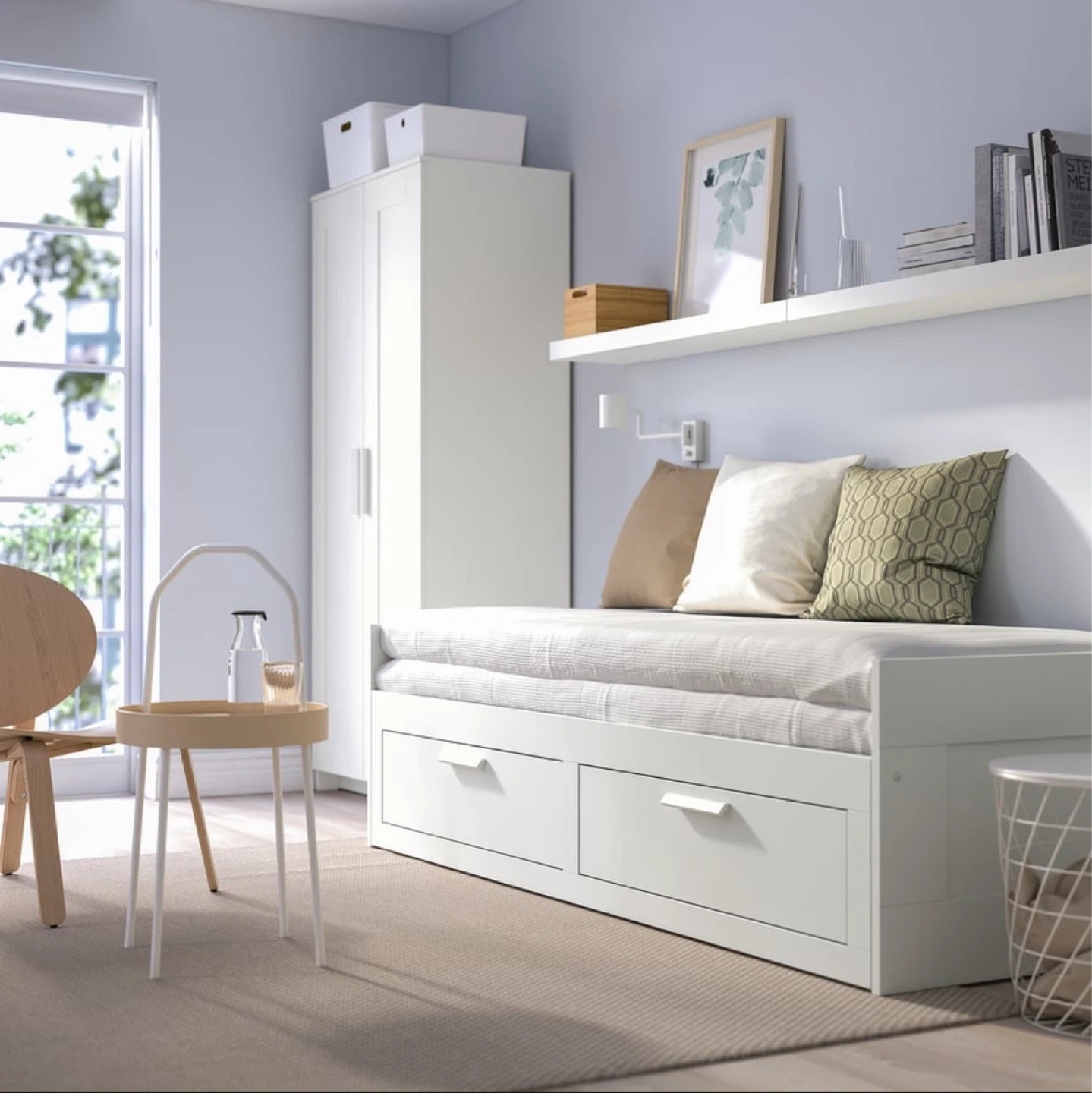 Selling a gently used IKEA daybed frame in white. This versatile piece is perfect for a guest room or living space, easily converting from a sofa to a single or double bed. It features handy drawers for extra storage, making it a practical and stylish addition to any home