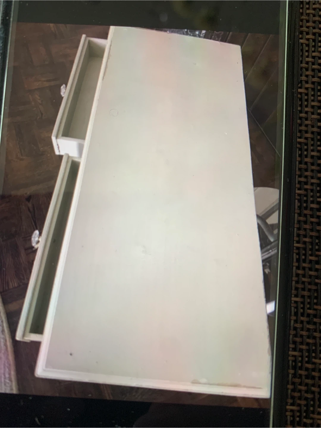 This cream-coloured cabinet features two ((no glass)-fronted doors and two drawers. It has ornate detailing and knob handles. It's suitable for storage and display.