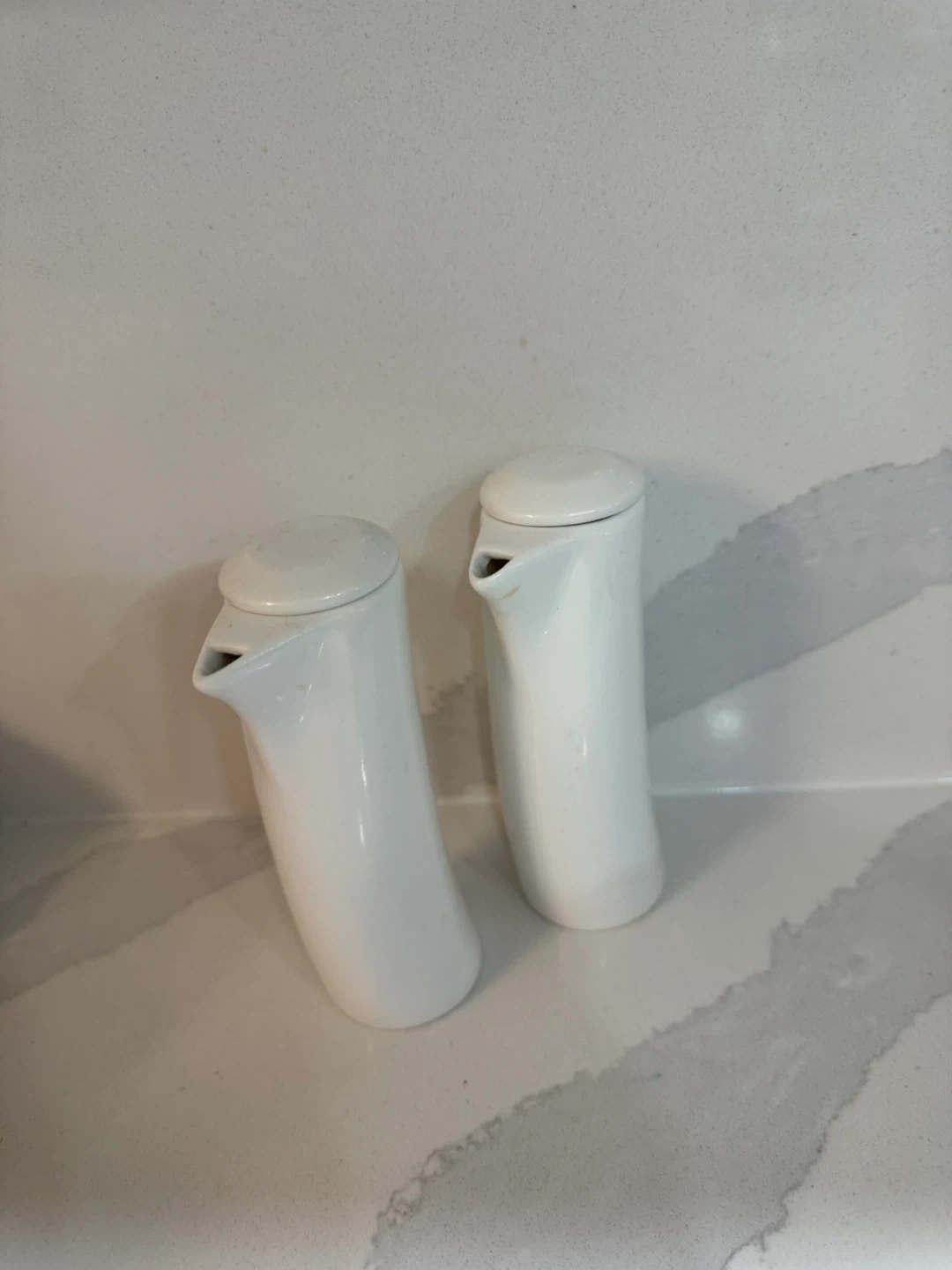 A set of two matching white ceramic creamer or sauce pitchers. They feature a classic design with a spout and lid. White ceramic material.